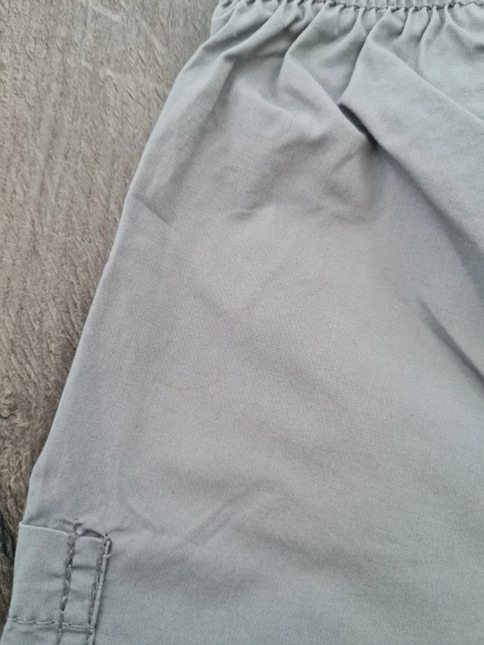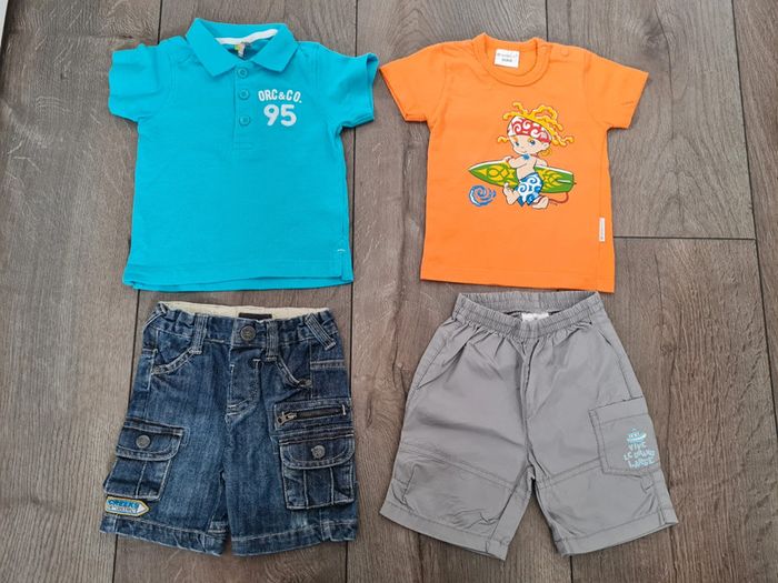 Les beaux jours approchent... 😊 4 vêtements d'été en 6 mois : 1 polo bleu turquoise manches courtes Orchestra. 1 tee-shirt orange, rapifebaby. 1 short en jean taille ajustable Creeks. 1 short gris taille élastique, Vive le grand large. Une très légère tâche indiquée sur photo de près.