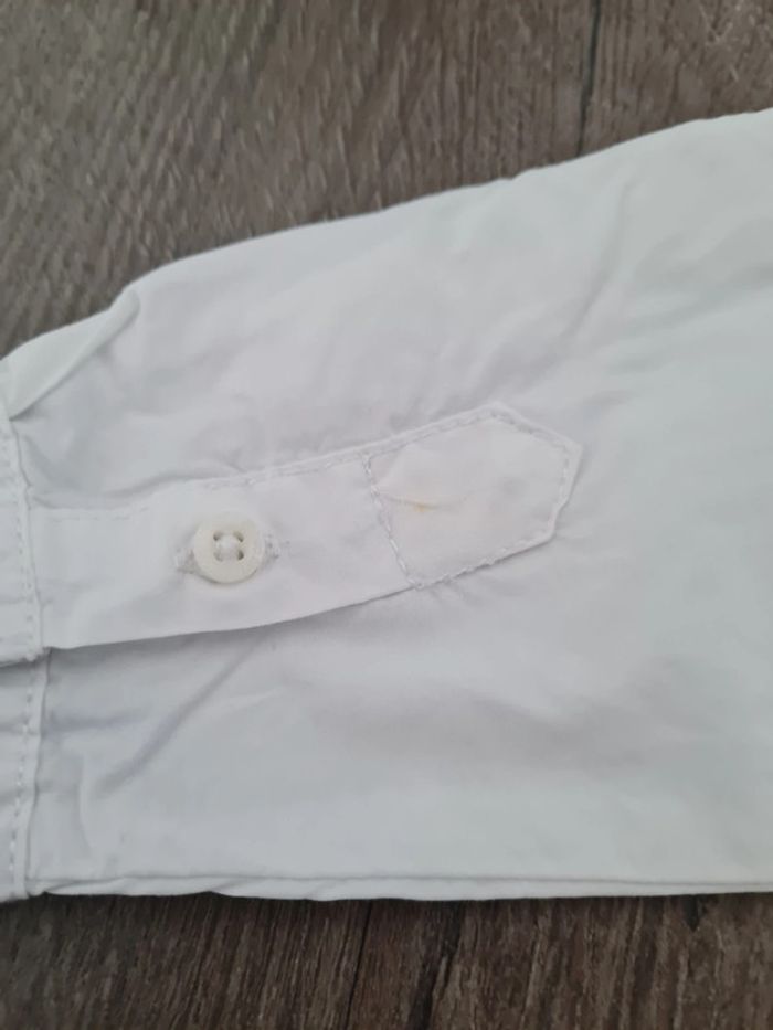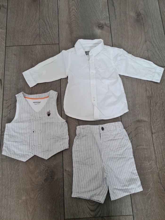 Très bel ensemble 3 pièces Orchestra 9 mois. Parfait pour une cérémonie : 1 gilet sans manches blanc rayé. 1 chemise blanche manches longues. 2 très légères tâches, très peu visibles, indiquées sur photos de près. 1 bermuda blanc à rayures. Taille élastique.