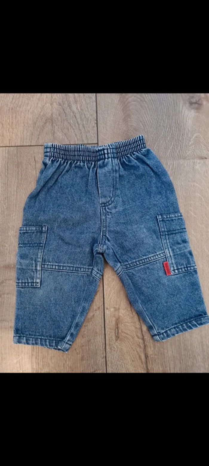 Lot de 4 pantalons 6 mois : 1 jean avec pressions entrejambes Kitchoun. 1 pantalon rouge H&M 4-6 mois. 1 jean taille élastique, poches style cargo. 1 jean effet used, Baby jeans original, Mayoral.