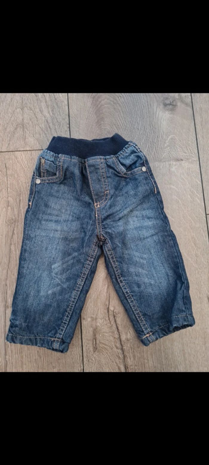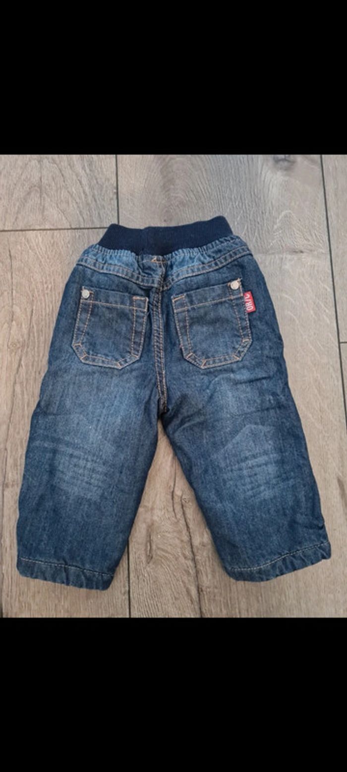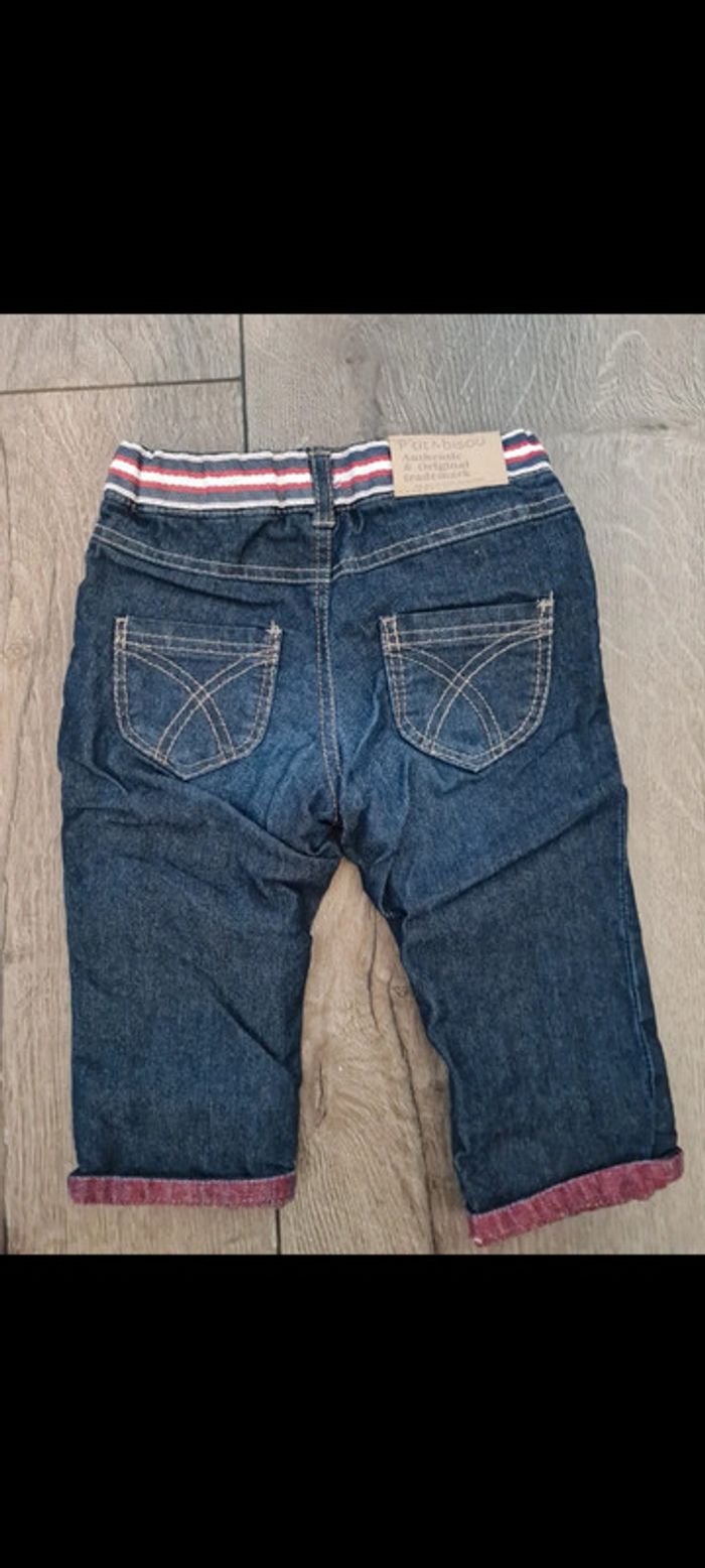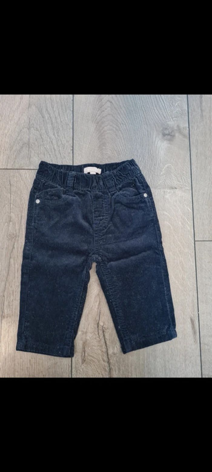 1 jean noir doublé, Orchestra. 1 jean bleu foncé doublé, Orchestra. 1 jean bleu foncé doublé, P'tit bisou. 1 pantalon kaki à poches style cargo. 1 pantalon en velours bleu marine, Grain de blé. 1 pantalon en velours beige, Bear expédition.