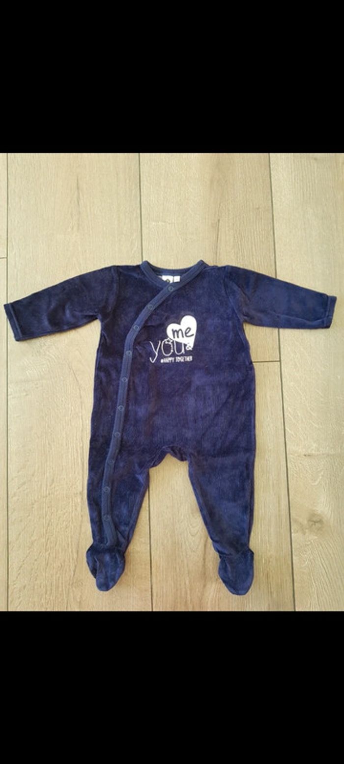 Lot de 2 grenouillères pour l'hiver : 1 bleu marine, marque Z, 9 mois mais taille comme le 6 mois. You & me Happy together. 1 parme violet avec rayures, Tissaia, 6 mois. Moi j'aime les guilis, étoiles.