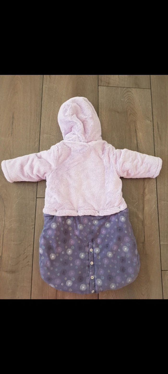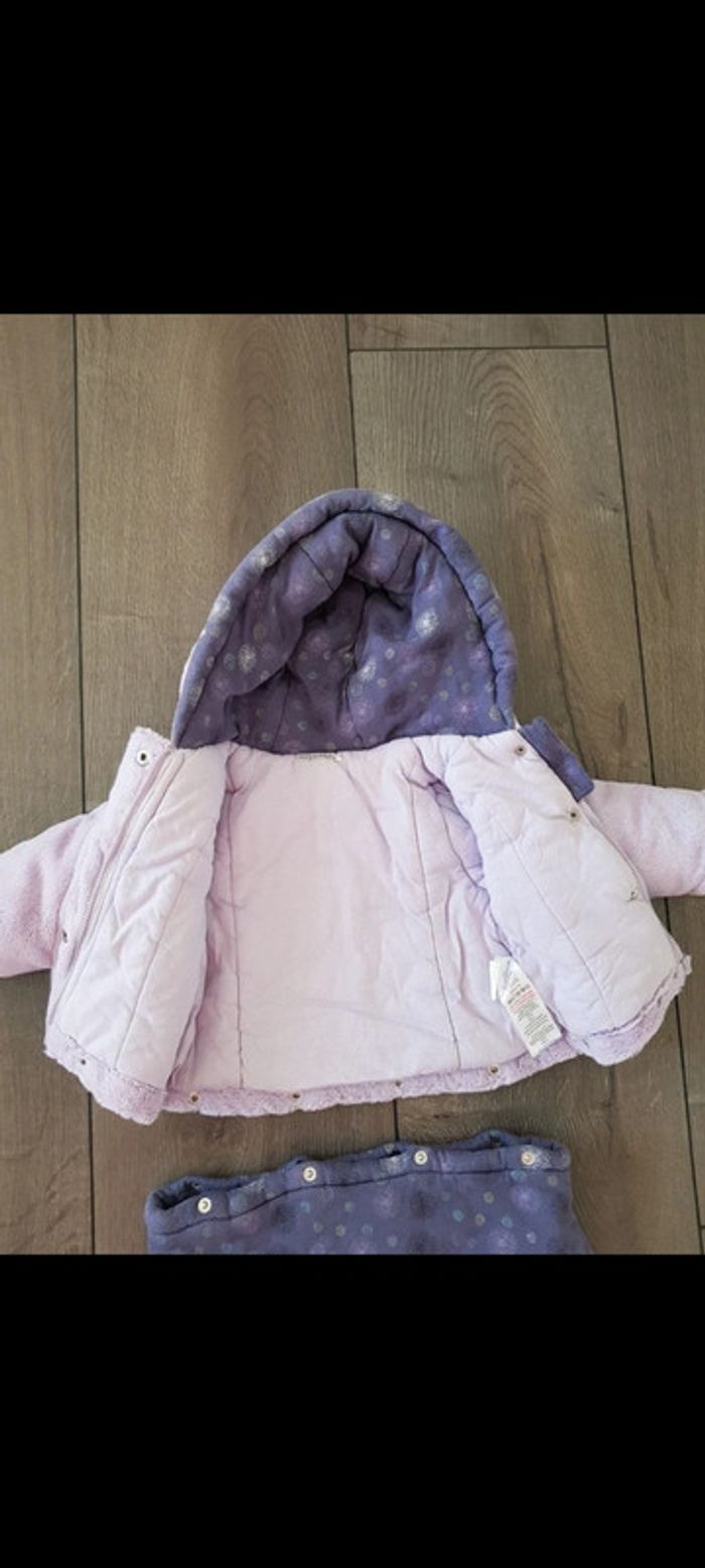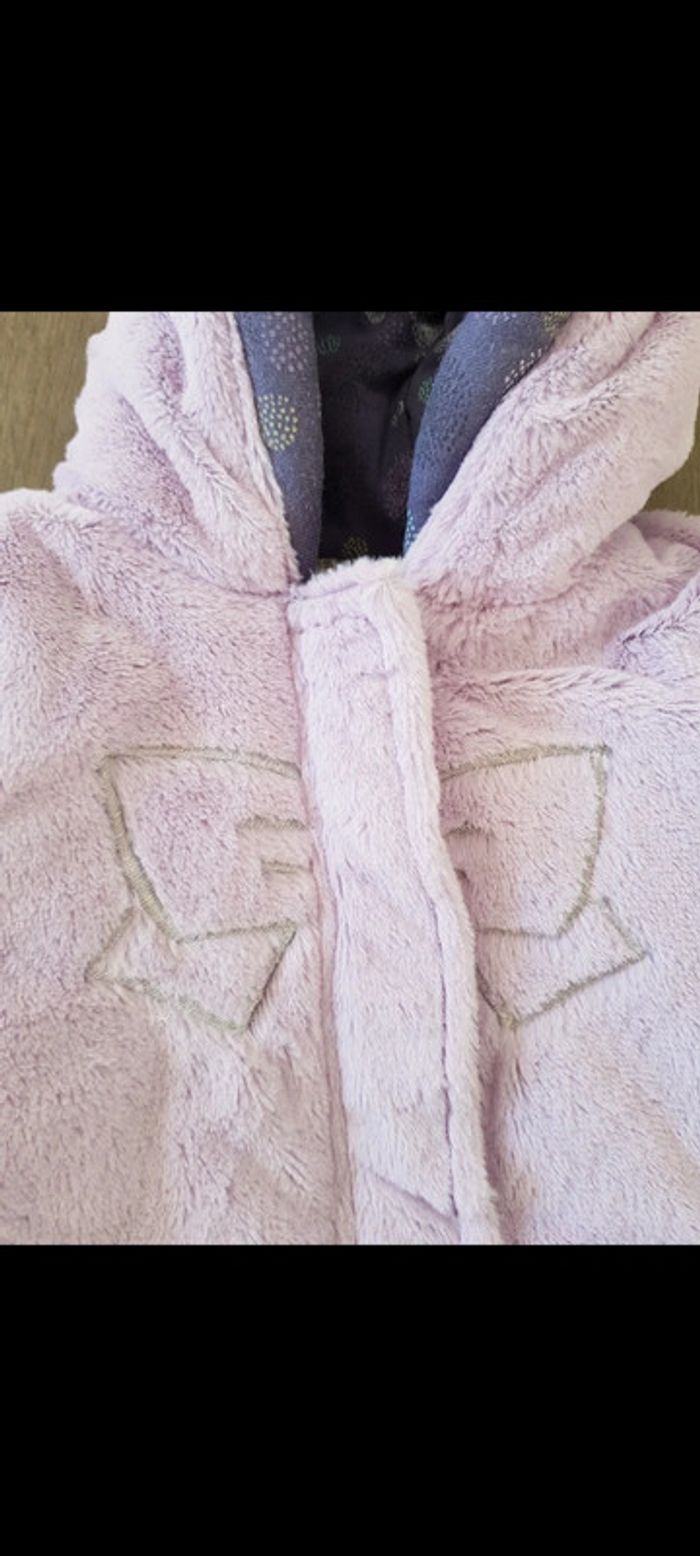 Manteau à capuche tout chaud, tout doux pour l'hiver. Mauve/violet. Votre fille sera couverte de la tête au pied. Aux jambes, des boutons pressions, pratiques pour le siège auto. Le bas est amovible, il peut devenir alors un simple manteau.