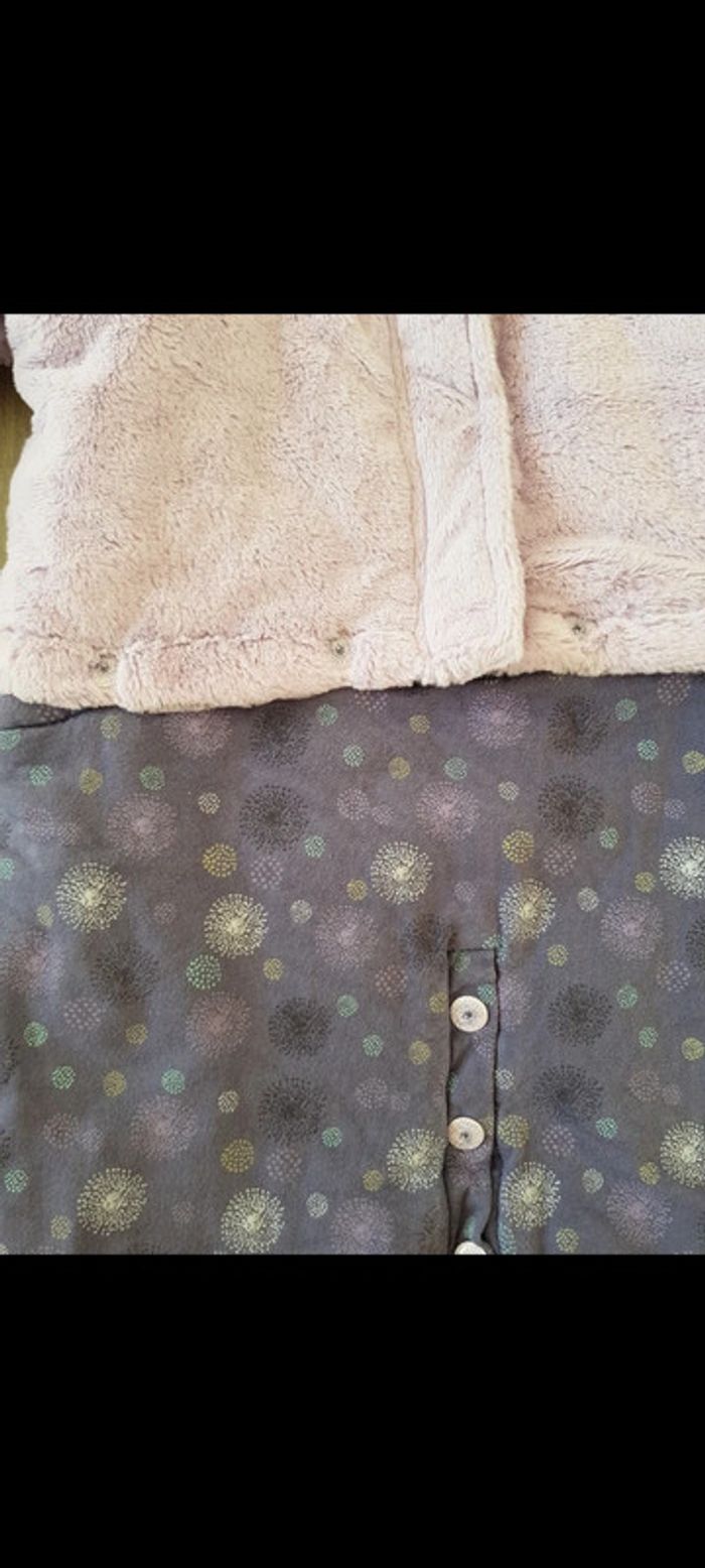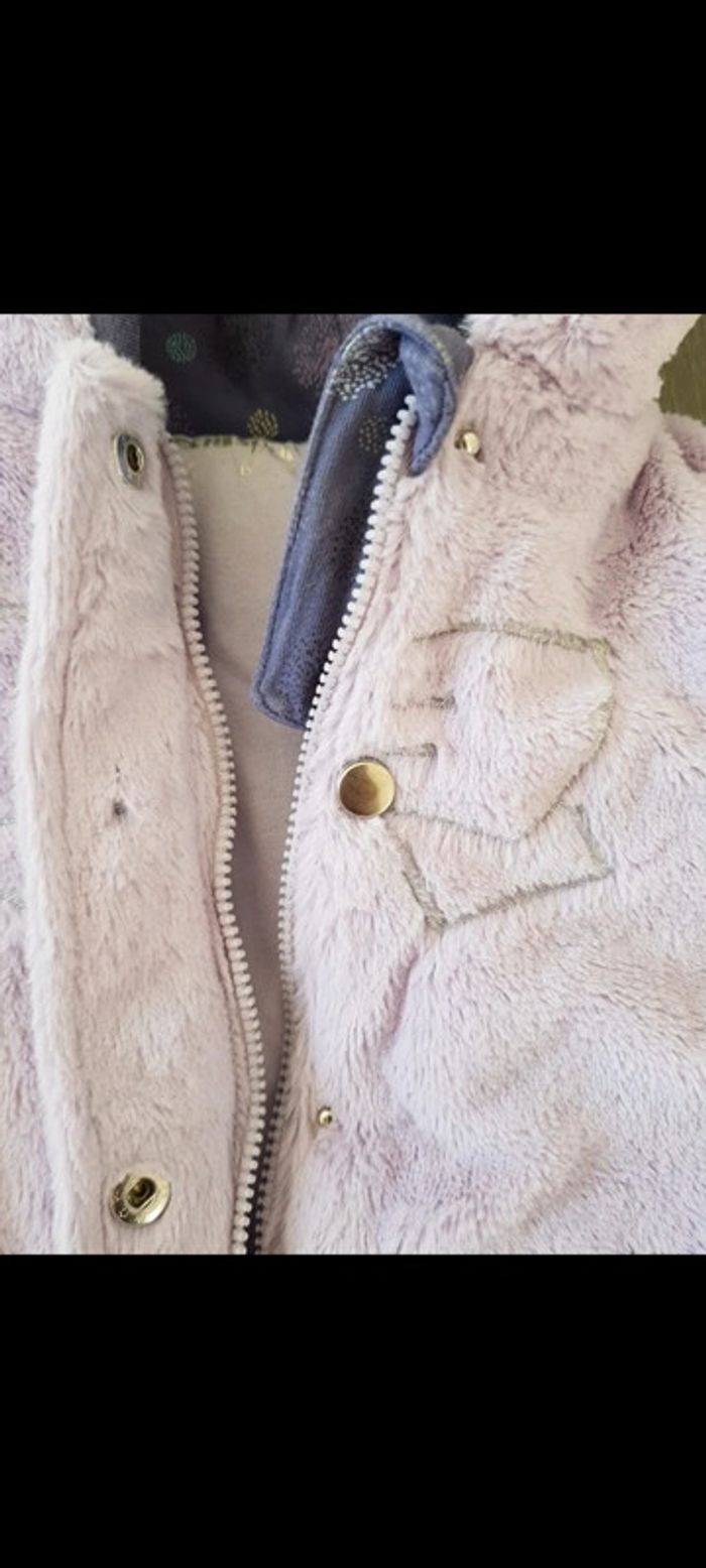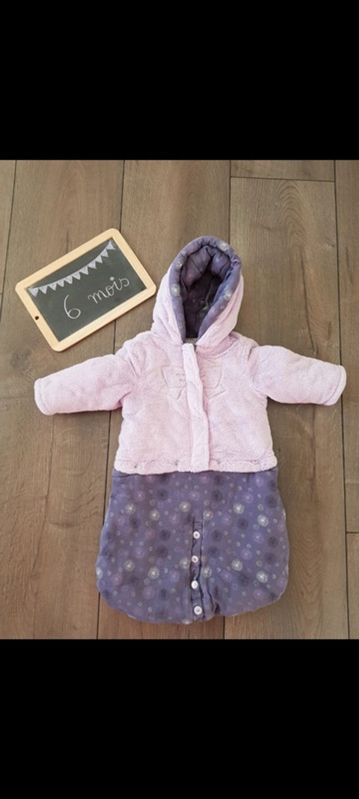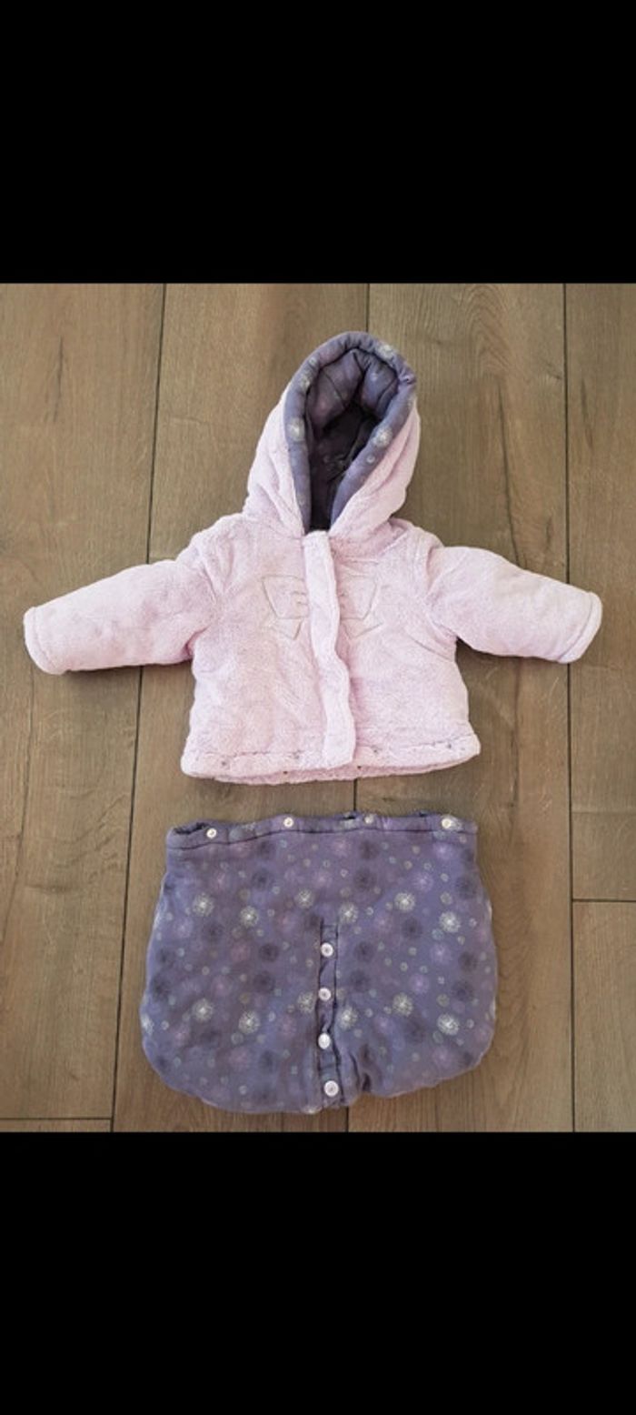 Manteau à capuche tout chaud, tout doux pour l'hiver. Mauve/violet. Votre fille sera couverte de la tête au pied. Aux jambes, des boutons pressions, pratiques pour le siège auto. Le bas est amovible, il peut devenir alors un simple manteau.