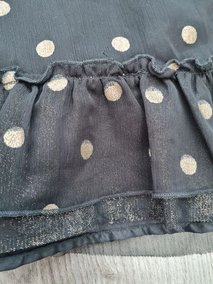 Robe sans manches noire à pois dorés. Tulle irisé en bas. Doublée. Magnifique pour une cérémonie. Noté neuve car portée une seule fois, comme neuve.