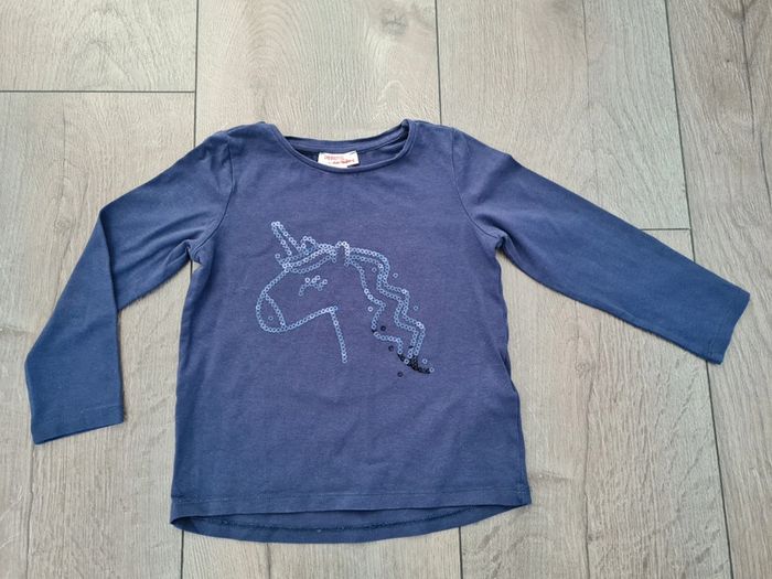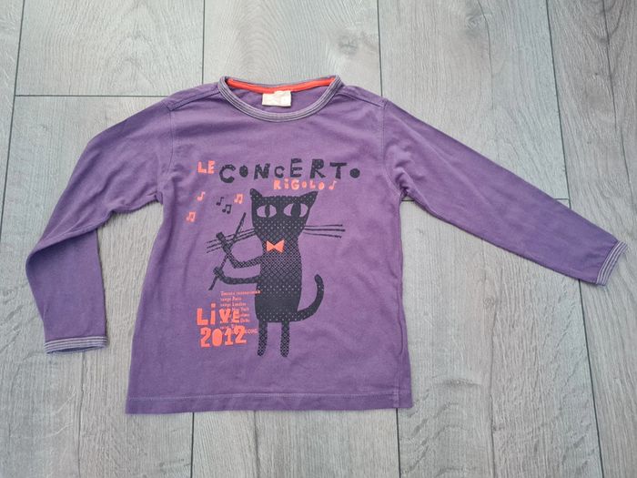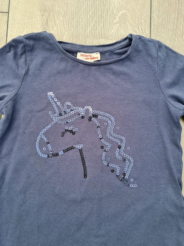 Tee-shirt manches longues Du Pareil au Même, 4 ans. Bleu marine. Motif licorne en sequins. Comme neuf Tee-shirt manches longues. Marque NKY. Taille mentionnée 5 ans, mais il taille petit donc je l'ai mis avec le 4 ans. BEAUTIFUL motifs ethniques. Tee-shirt violet manches longues DPAM 4 ans. Motif chat " le concert rigolo".