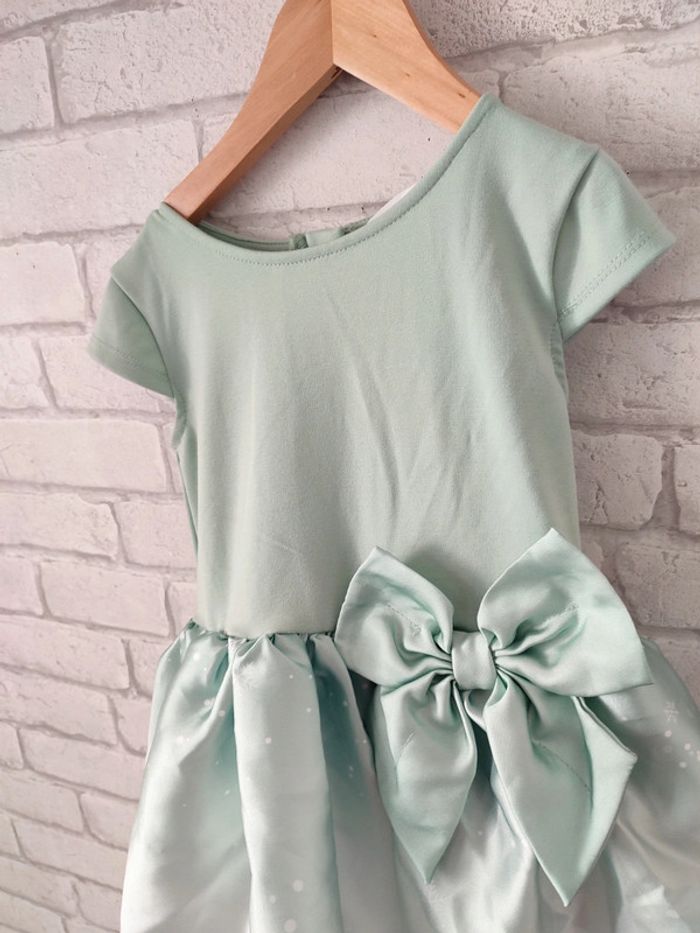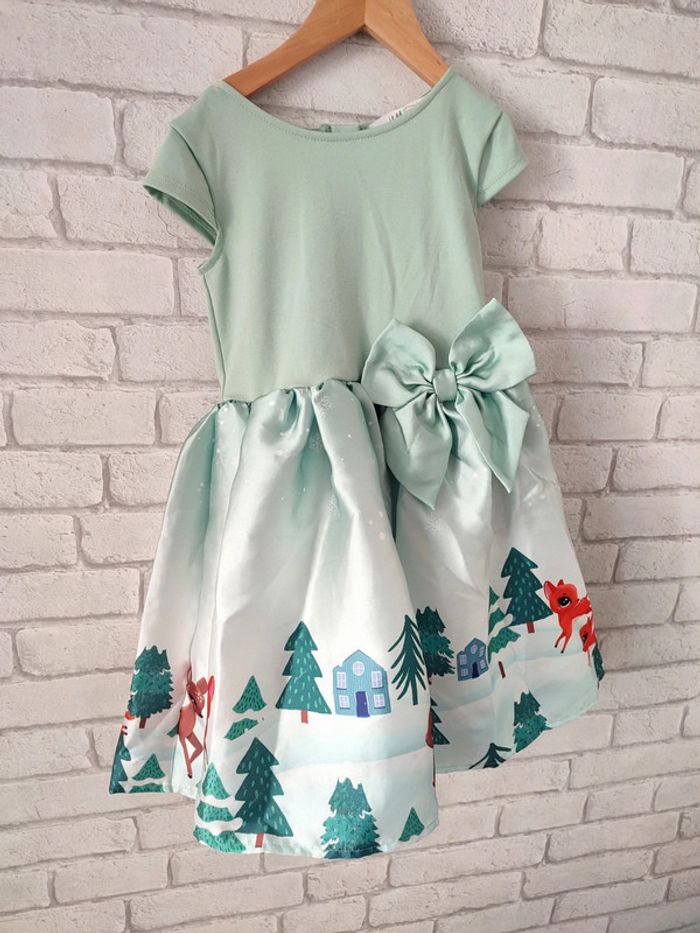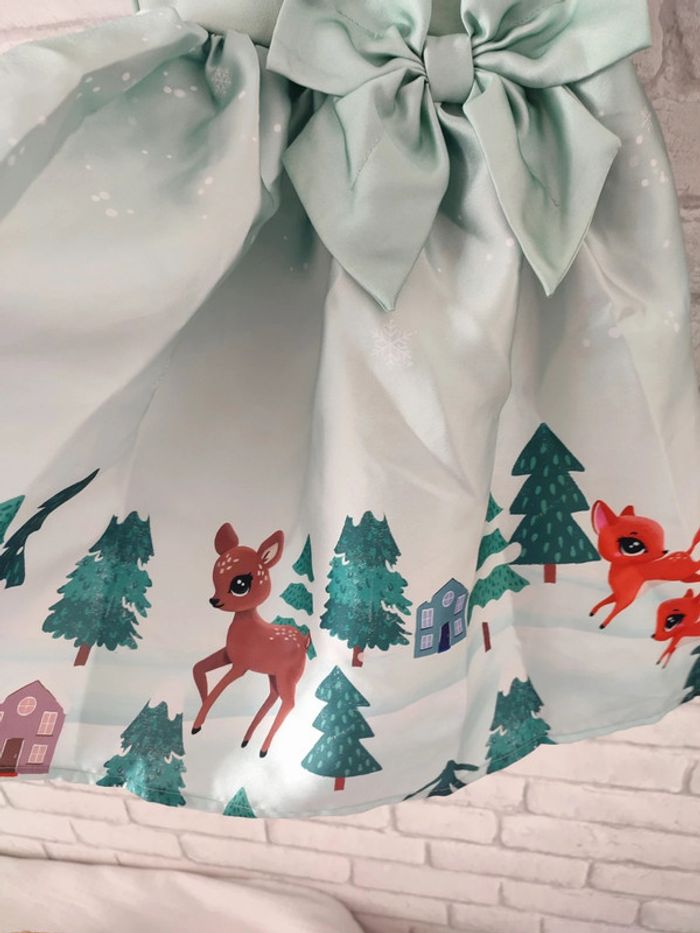 Très jolie robe de la marque H&M Couleur menthe satiné avec imprimé hivernal : renard, biche, sapin.. gros noeud sur le côté - forme légèrement évasée en bas remise activée sur les lots