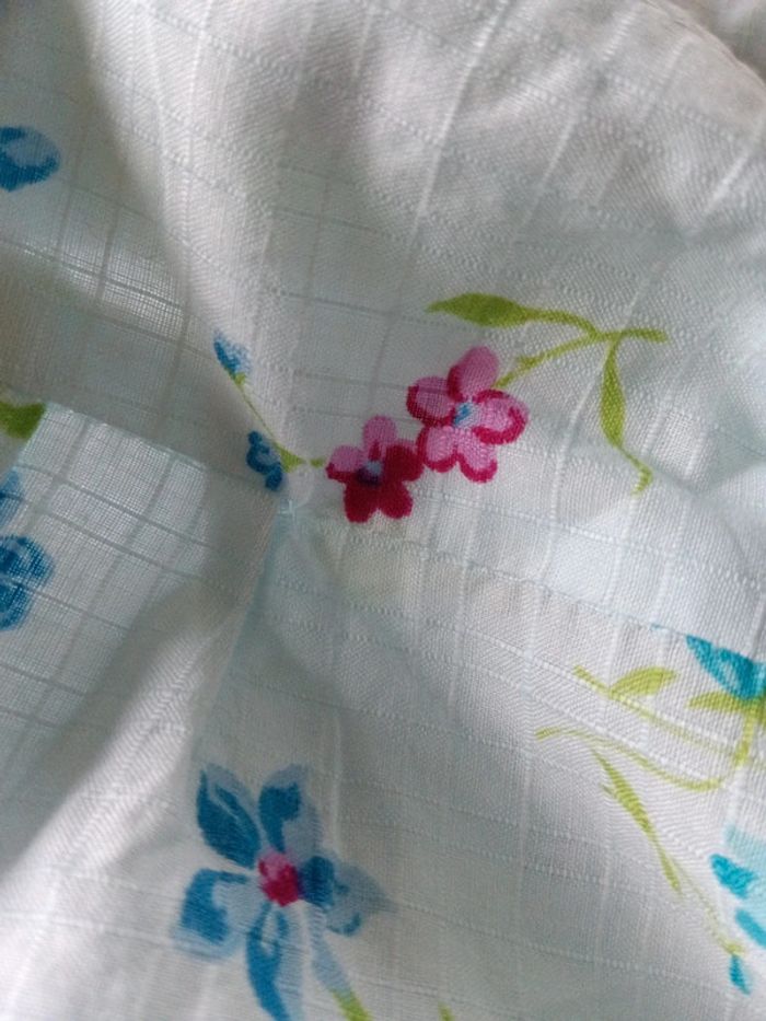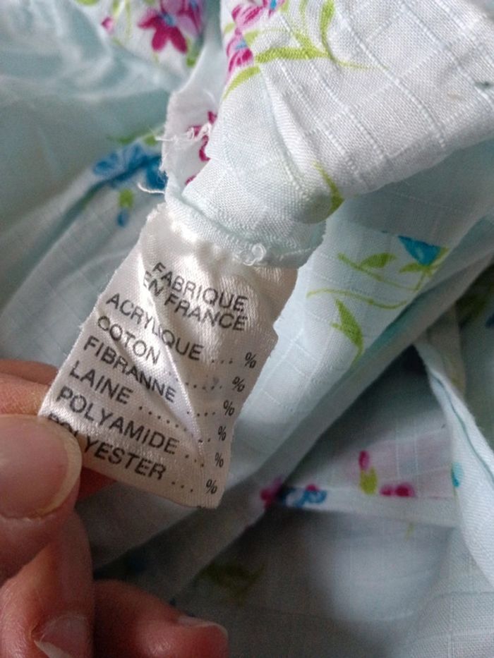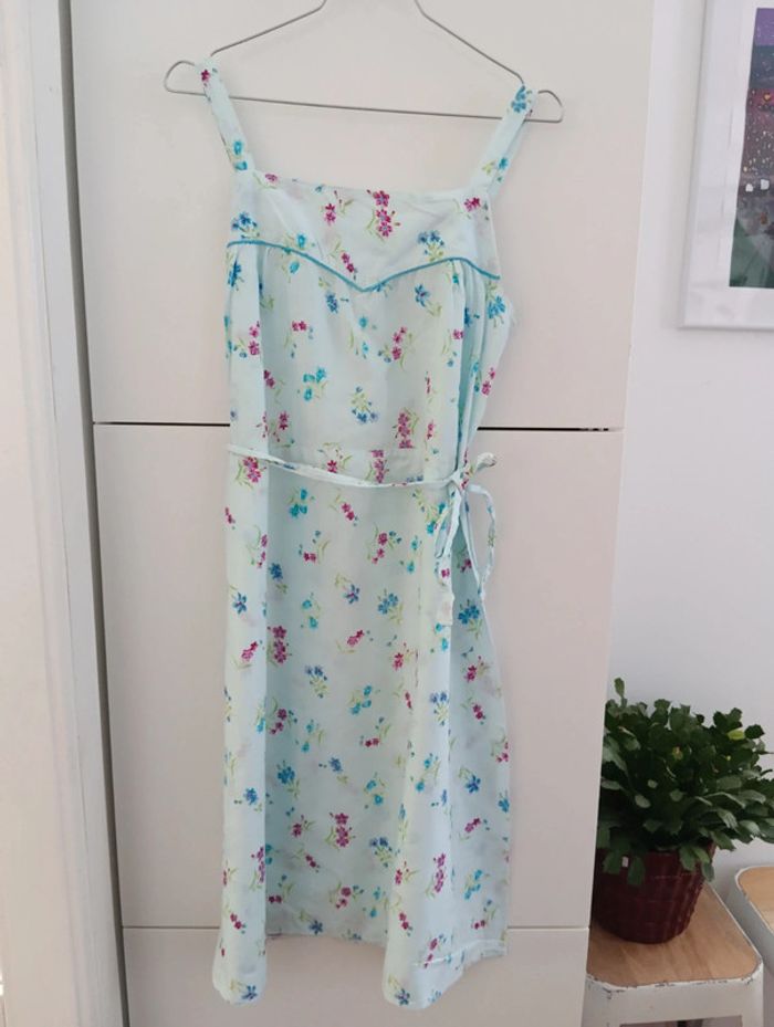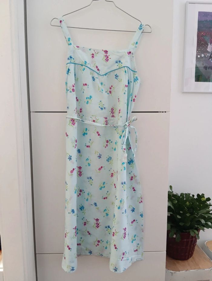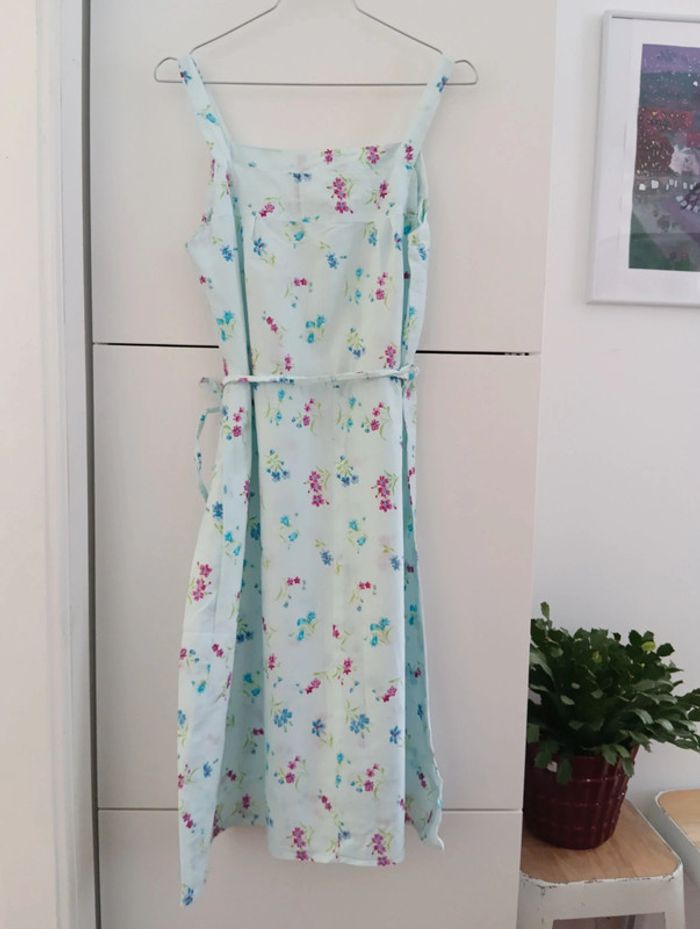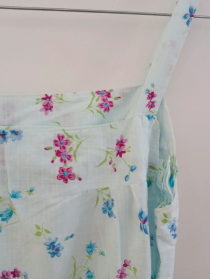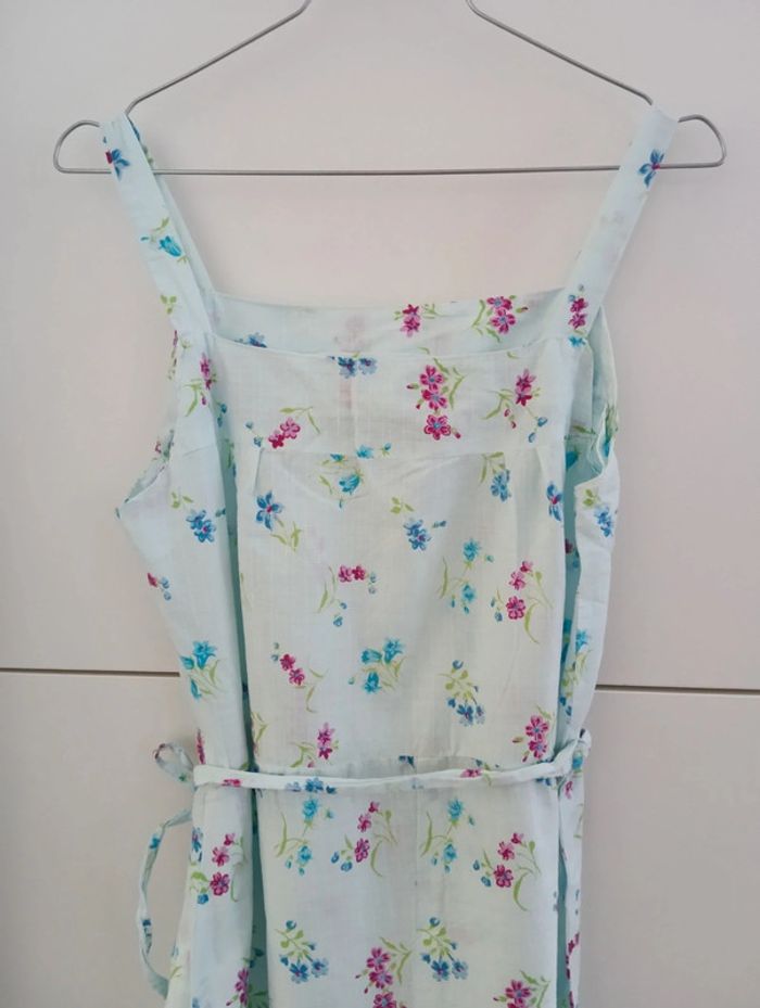 Robe vintage bleu pâle fleurie coton à bretelles Fabriquée en France. Lien attaché pour ajuster la taille. Taille 38 estimée à confirmer avec les mesures Aisselles 43cm Longueur 101cm Petit point de couture au dos, peu visible.