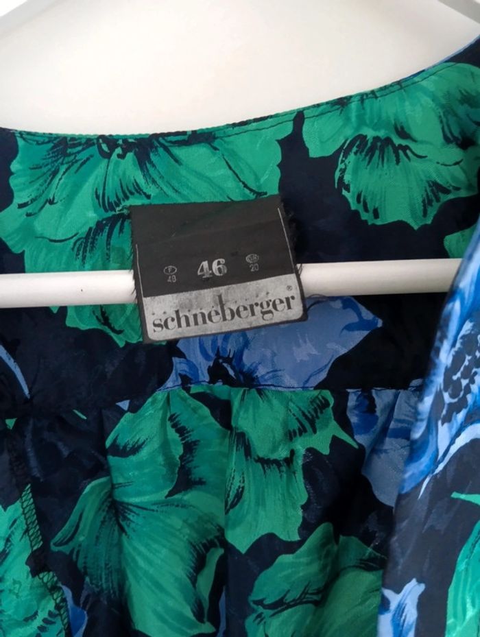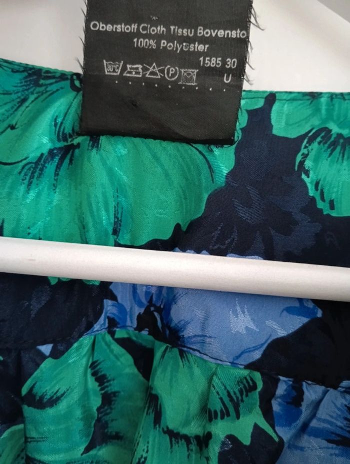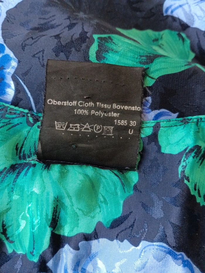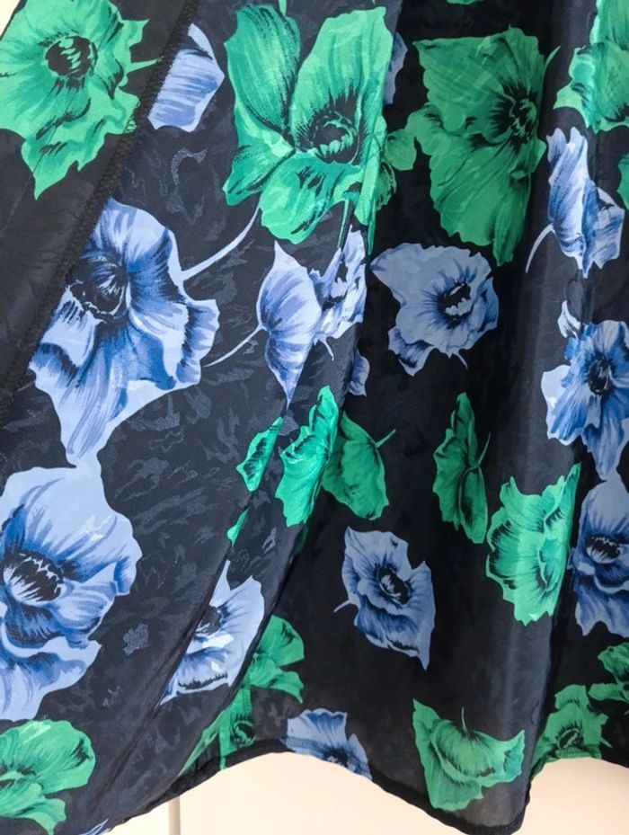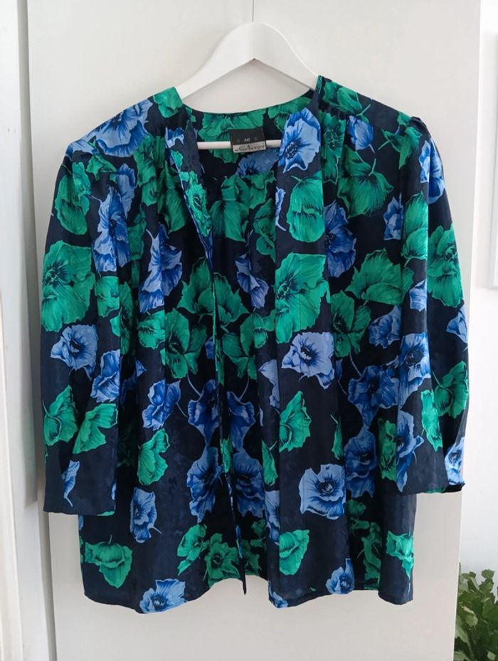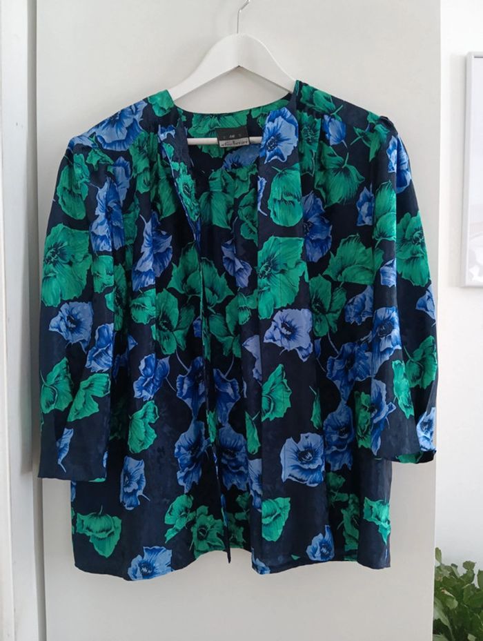 Veste légère vintage sans boutons fleurie vintage Fleurs bleu et vertes sur fond noir. Epaules froncées Taille 42 estimée à confirmer avec les mesures selon l'effet souhaité. Mesures Epaules 43cm Aisselles 62cm Longueur 67cm