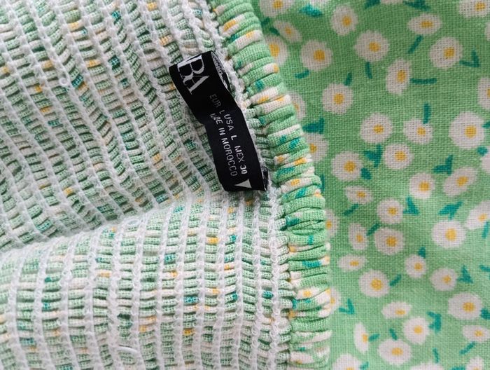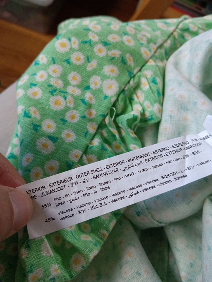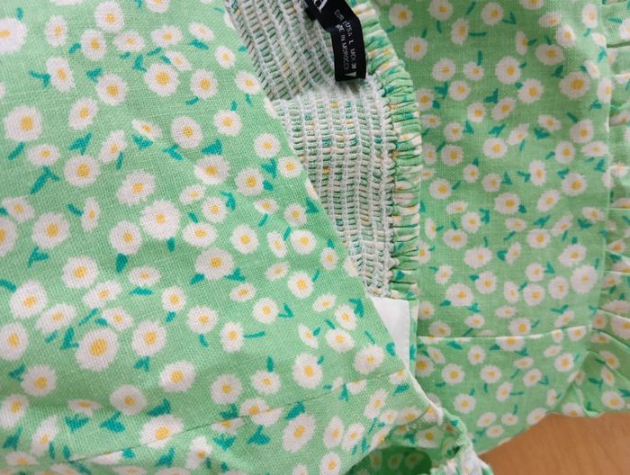 Mini robe verte a fleurs Zara Fond vert imprimé pâquerettes. taille L indiquée mais convient davantage à M 55% lin 45% viscose Dos smocké, ceinture assortie Bas volanté Mesures aisselles 43cm Taille 38cm Longueur 79cm