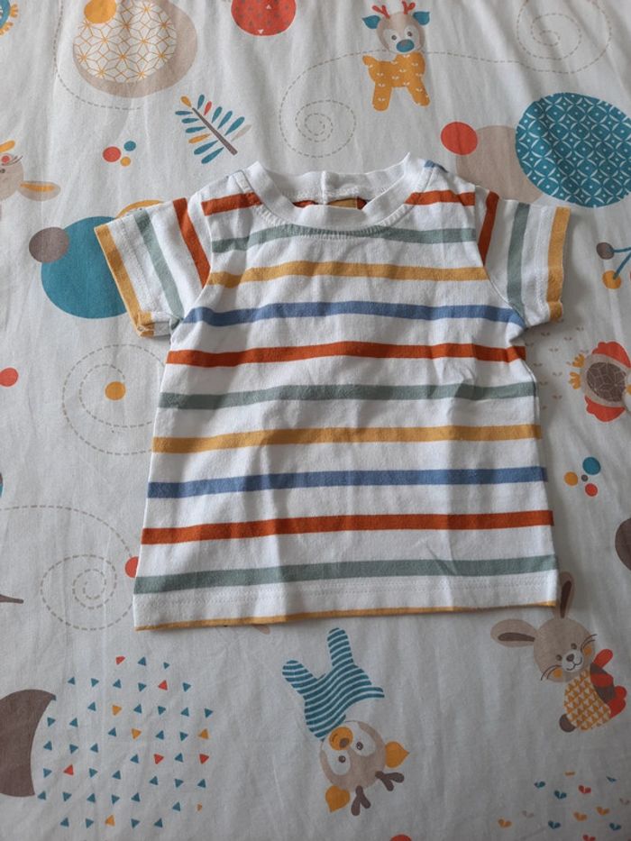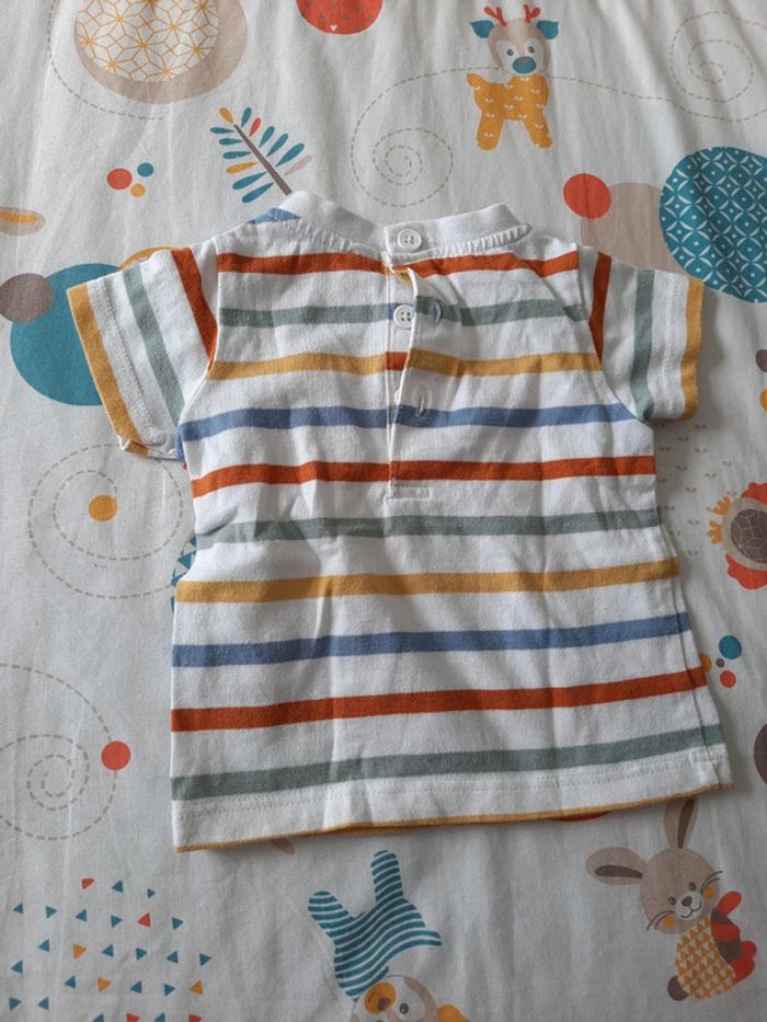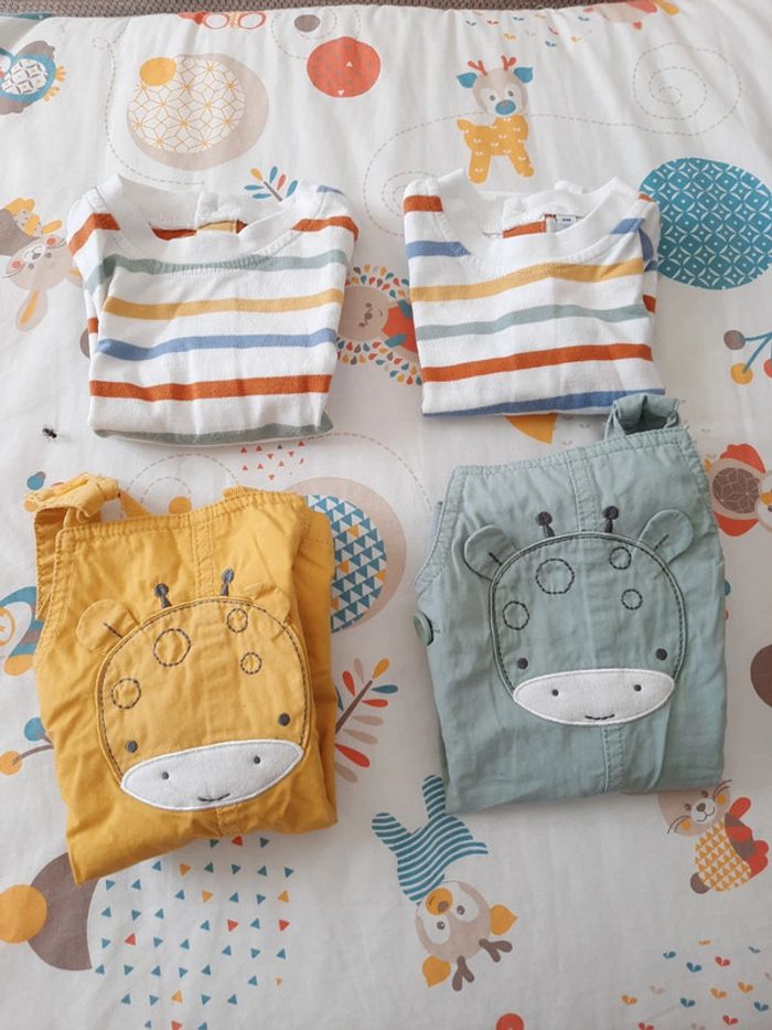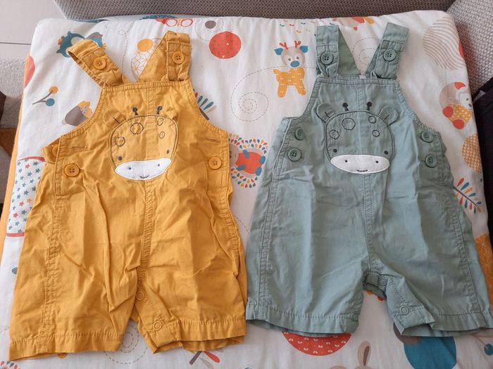 》1 salopette courte de couleur jaune avec tête de girafe et ouverture à boutons au niveau de la taille et des bretelles et boutons à pressions au niveau du bas 》1 salopette courte de couleur vert d'eau avec tête de girafe et ouverture à boutons au niveau de la taille et des bretelles et boutons à pressions au niveau du bas 》2 maillots à rayures multicolores avec ouverture à boutons sur l'arrière qui vont avec chacune des salopettes Les 2 sont de la même gamme en très bon état. Taille 3 mois