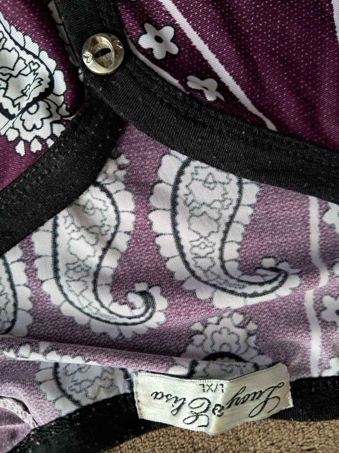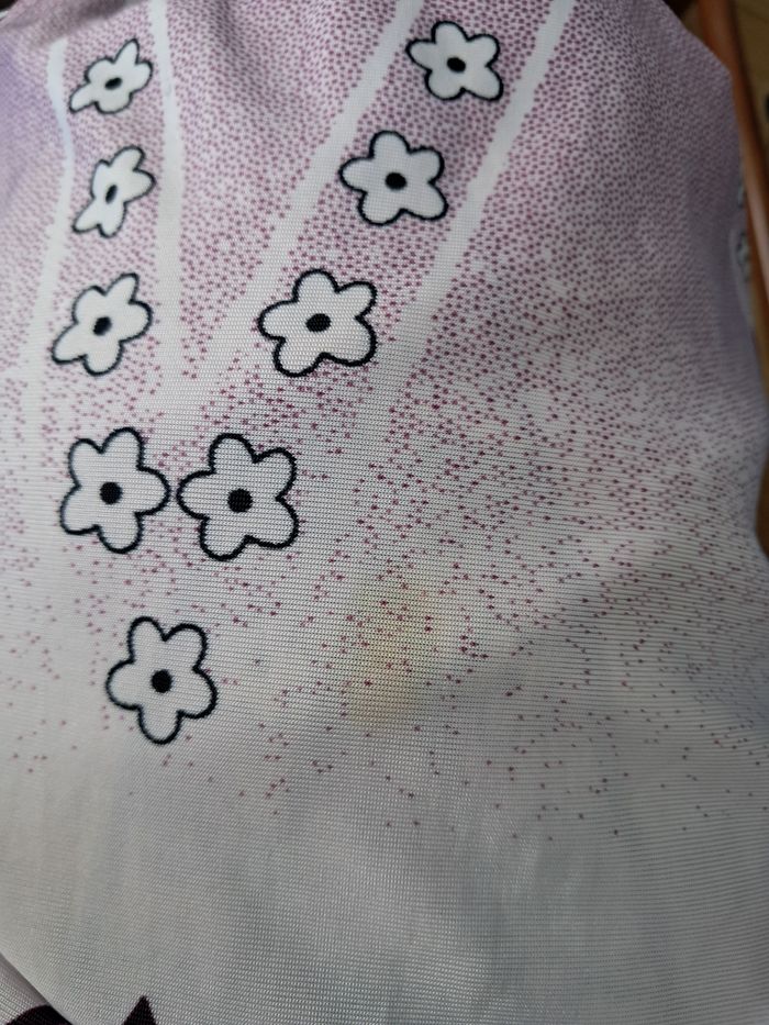 Robe couleur violette fleurie 80%coton 15%polyester 5%elasthane Très bon état Une petite tache jaune (voir derniere photo)