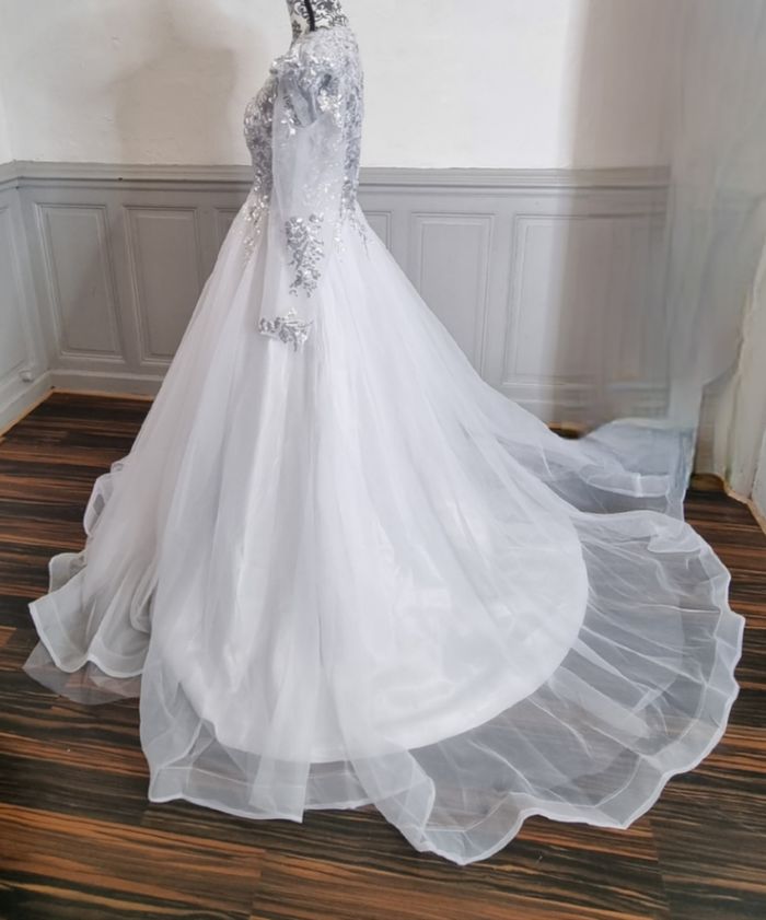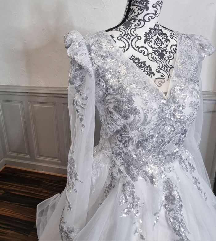 robe de mariee princesse avec traine buste avec sequins argenté manche épaules bouffantes taille 38 - photo numéro 2