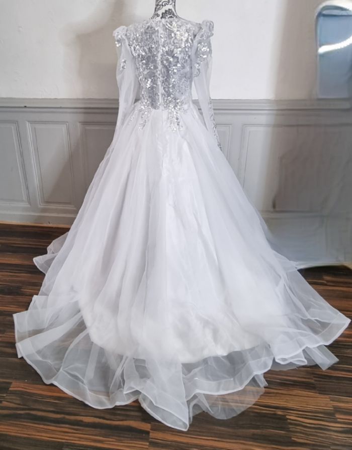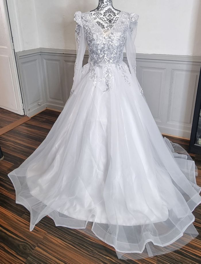 robe de mariee princesse avec traine buste avec sequins argenté manche épaules bouffantes taille 38 - photo numéro 1