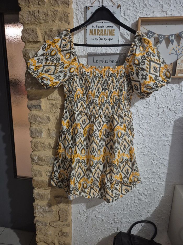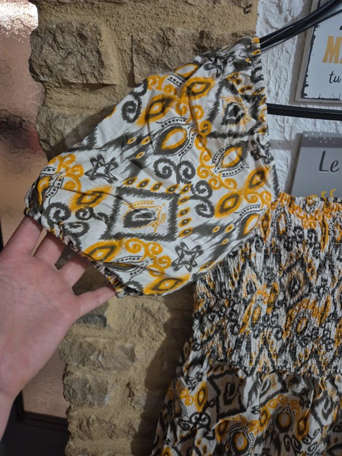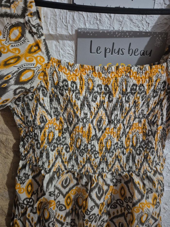 Très jolis motifs. Cols carrés devant et derrière. Smocké à la poitrine. 55%lin 45% coton. #robeété #ethnique #boheme