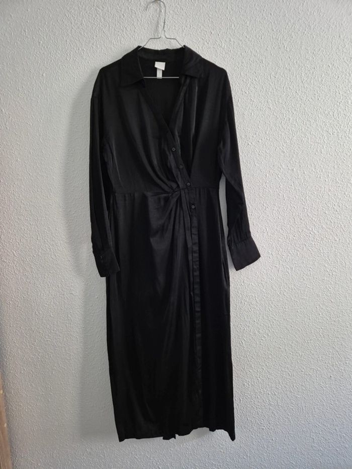 Robe mi-longue noire Col cache cœur Aucun défaut d'usure. En très bon état. Longueur totale: 124 cm Longueur manche : 55 cm Tour de tailel: 70 cm Largeur épaule : 46cm N'hésitez pas si vous avez la moindre question 🌷