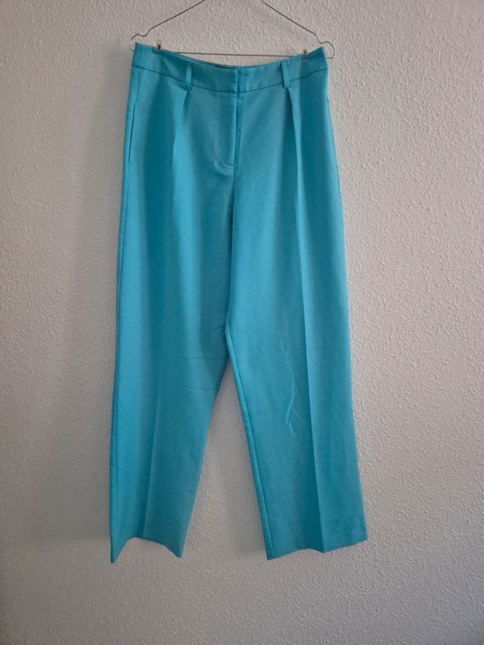 Pantalon de tailleur fin Bleu turquoise Neuf avec étiquette, sans défaut Longueur totale: 107 cm Longueur entrejambe: 77 cm Tour de taille : 76 cm N'hésitez pas so vous avez la moindre question. ⚠️ Réductions en lot jusqu'à -50% sur mon dressing ⚠️