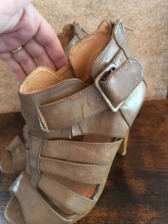 Chaussures à talon 38 Hauteur Talon : 11 cm Bon état Marron / crème (tâche effet vieillissement original acheter comme ça ) Marque : K women Prix : 12€ Disponible immédiatement Envoie rapide et soigné Quelque petites imperfections car ont était porter ! Remise activé sur l'achat d'un lots ❤️