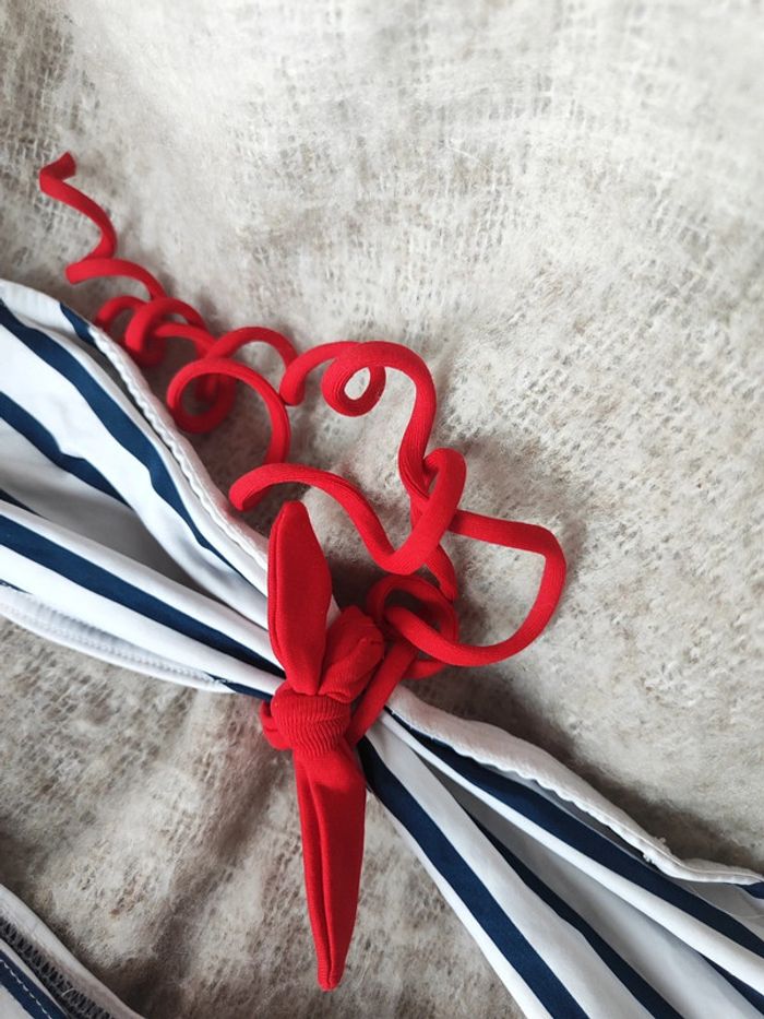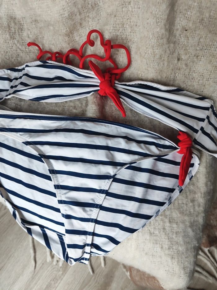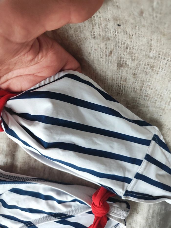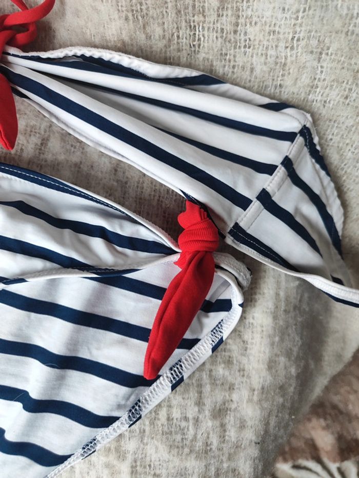 Maillot de bain Etam marinière bleu blanc et rouge Haut bandeau avec noeud rouge autour du cou taille S (les coques ont été retirées) environ 85B Bas taille 38