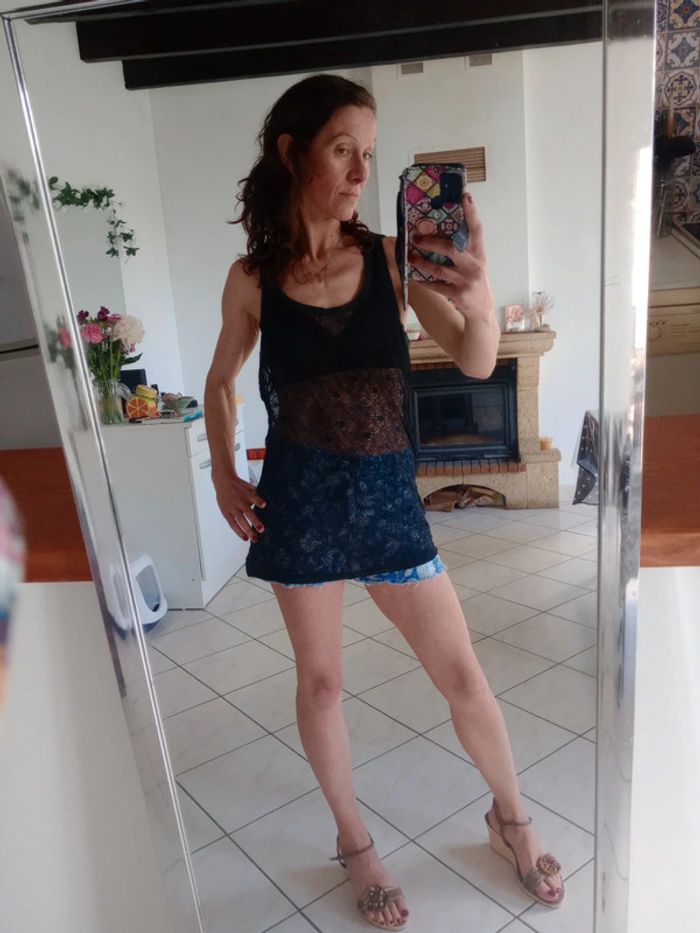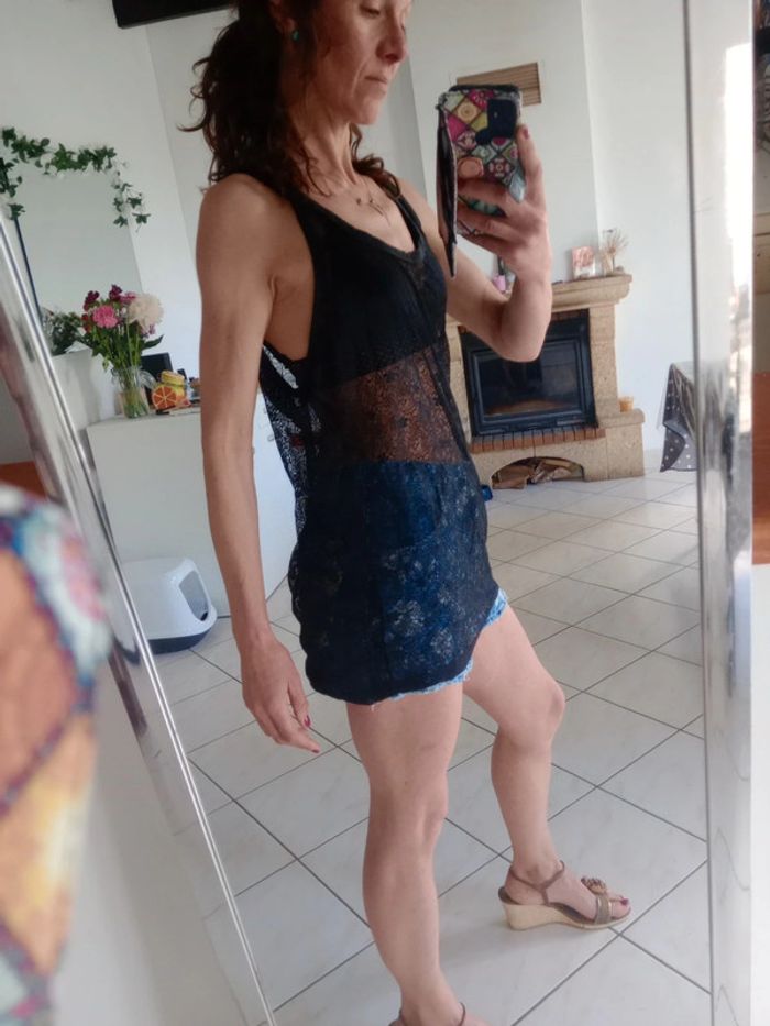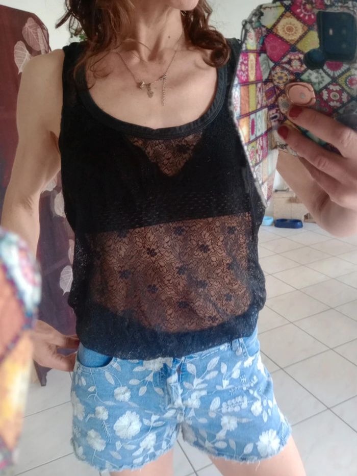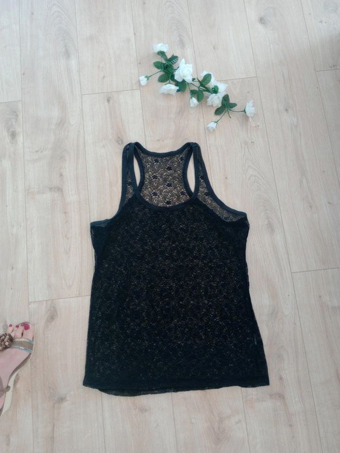 Débardeur dentelé noir, so sexy Présence de petites élastiques voir dernière photo. Ainsi je le classe dans la catégorie bon état Aisselle 53 cm bretelles 28 cm longueur 74 cm Plus d'étiquette matière ni taille ni marque #carineleray_femme_42