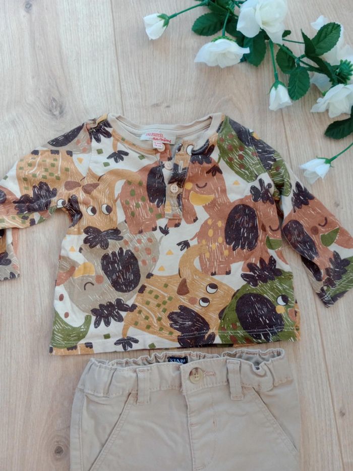 Impeccablement entretenu 😍 Lot composé d'un t-shirt à manches longues de marque du pareil au même (plus d'étiquette matière je pense à du coton) et d'un pantalon beige de marque Kiabi : présence d'une ceinture élastique à l'intérieur matière coton élasthanne #carineleray_12m