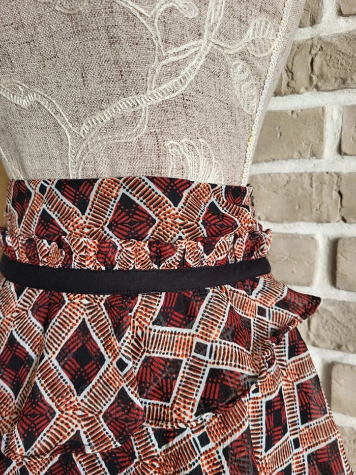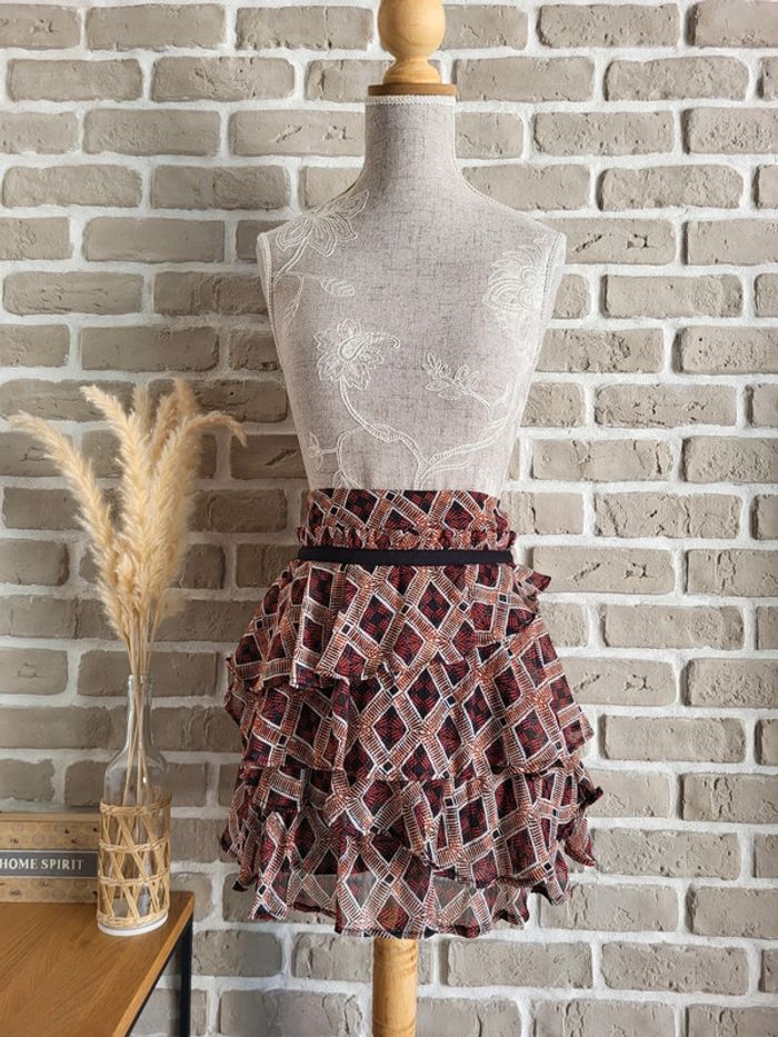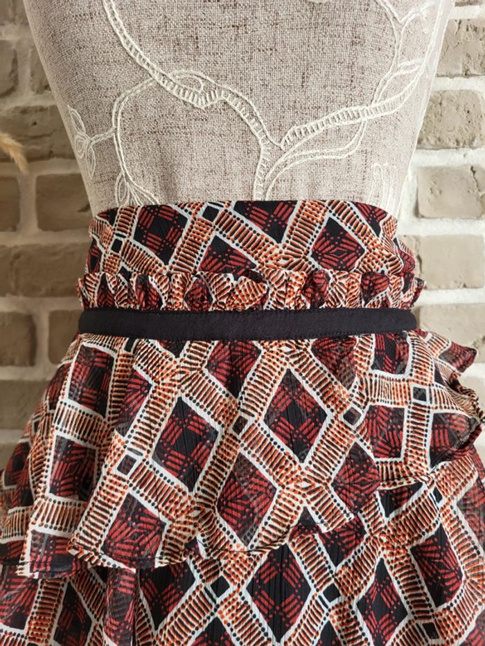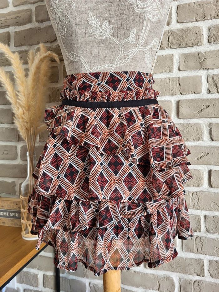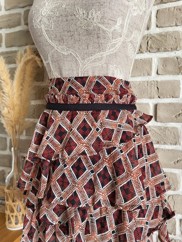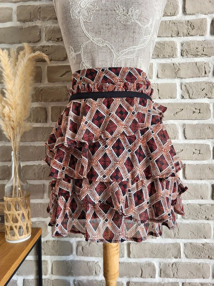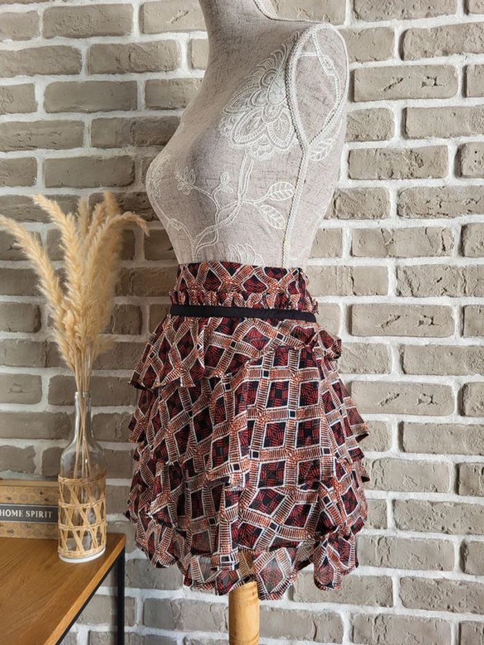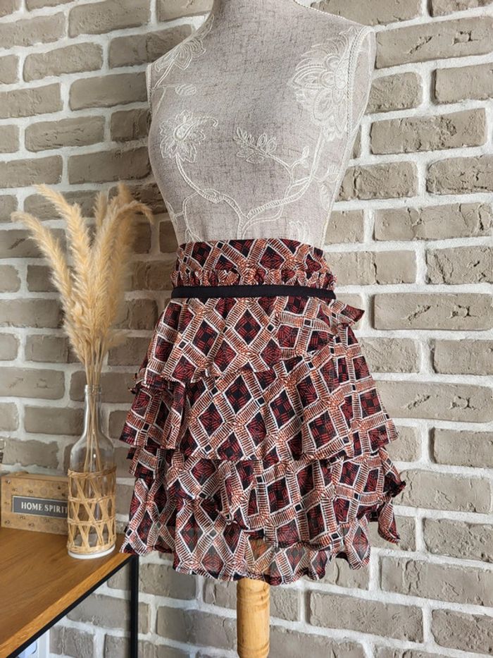 💝 Bénéficiez d'une réduction en créant lot dans mon dressing 🛍️ 🌸 Très jolie jupe de La Redoute neuve, jamais portée 🎀 Voile léger imprimé ethnique dans les tons chauds : marron, brique et terracotta Entièrement doublé 🪷 Superposition de 4 lignes de volants disposées de manière asymétrique Bande noire marquant la taille avec des petits froufrous au dessus Ouverture sur le côté par un zip 🍥 Taille S 36 Longueur : 42 cm 🩷 Cette jupe apporte beaucoup de style à votre tenue et peut se porter tout simplement avec un débardeur noir ou blanc