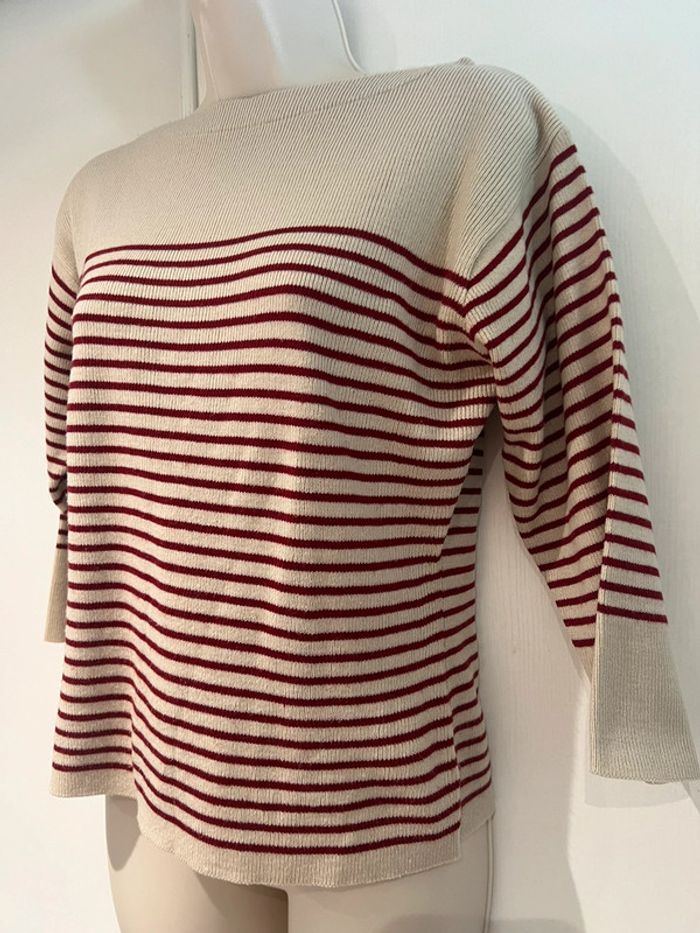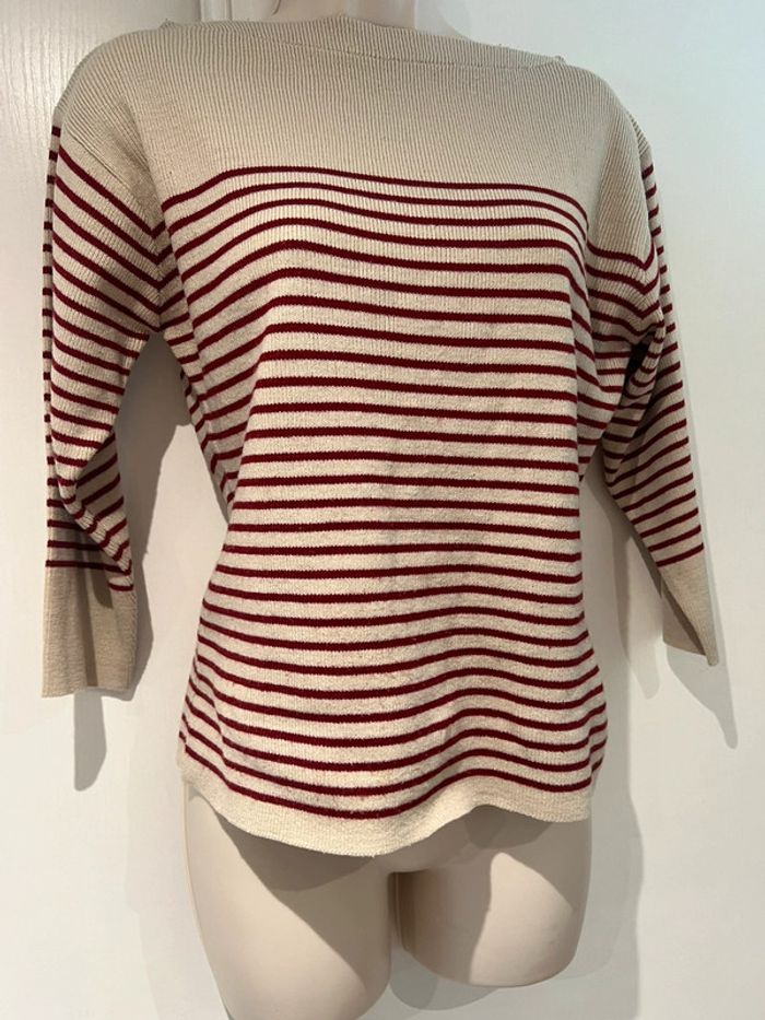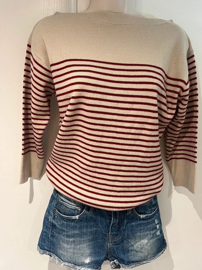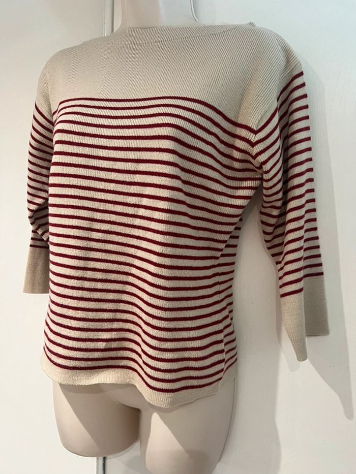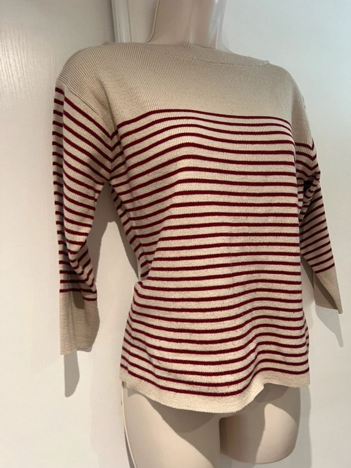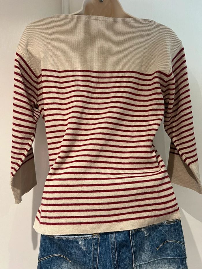 Je vends un petit style Pull Marin Taille 40, Il est très élastique De la marque avant Saisons Taille 2/40 La couleur est plutôt bien représentées en photo. C’est un beige rouge foncé. Il est en très bon état. Les mesures sont données ci-dessous, longueur d’une manche, 39 cm, largeur d’une épaule 9 cm Largeur d’une épaule à l’autre 41 cm Largeur sous les aisselles 50 cm Longueur milieu de l’épaule jusqu’en bas 56 cm. La taille est légèrement légèrement resserrée 41 cm, Bas de Pull, 43 cm Oran28