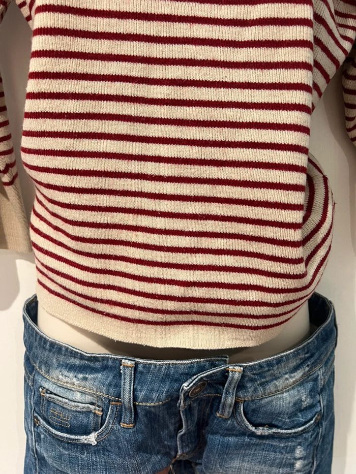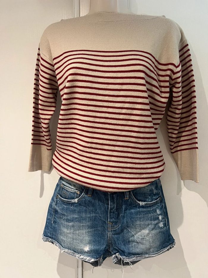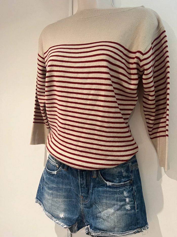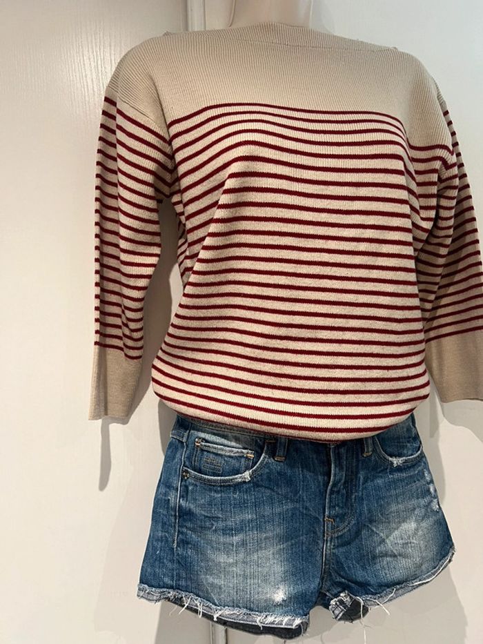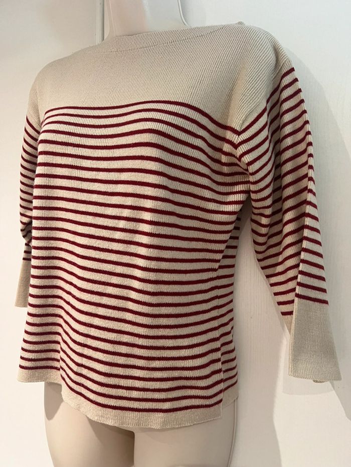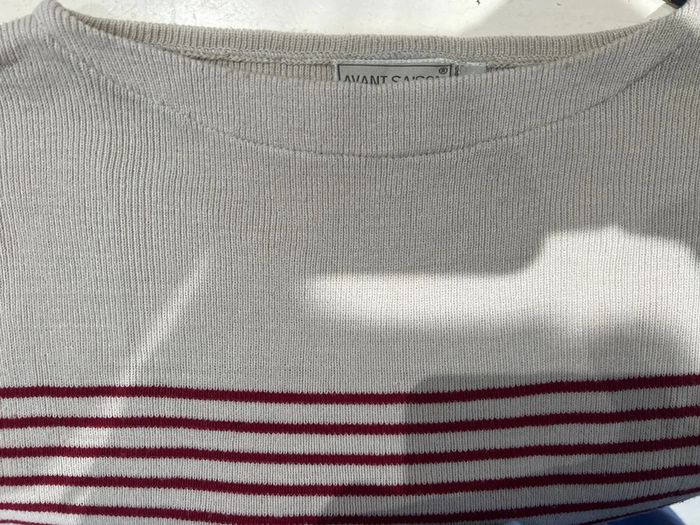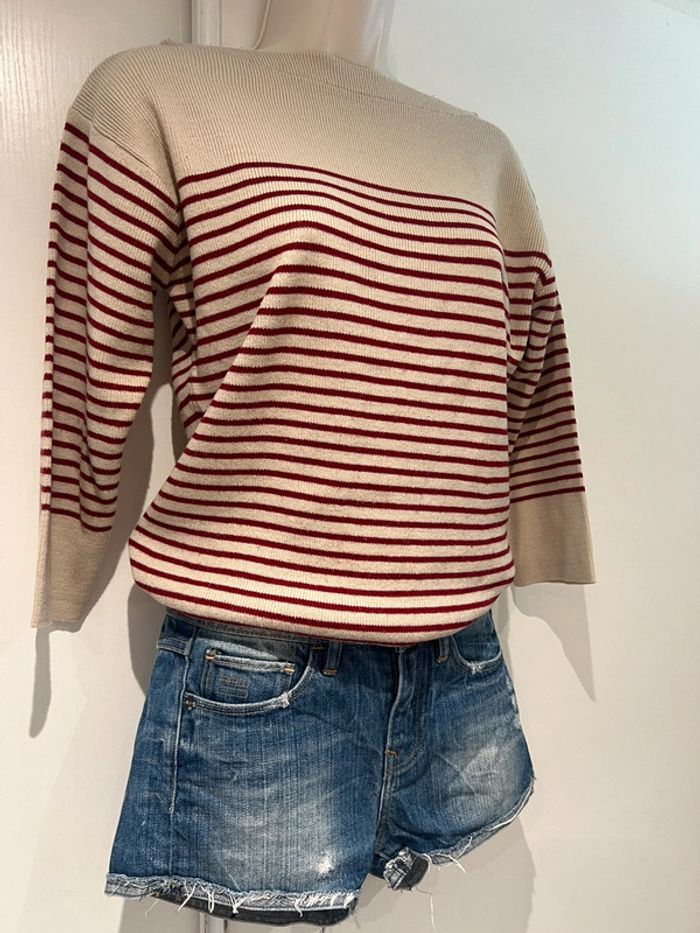 Je vends un petit style Pull Marin Taille 40, Il est très élastique De la marque avant Saisons Taille 2/40 La couleur est plutôt bien représentées en photo. C’est un beige rouge foncé. Il est en très bon état. Les mesures sont données ci-dessous, longueur d’une manche, 39 cm, largeur d’une épaule 9 cm Largeur d’une épaule à l’autre 41 cm Largeur sous les aisselles 50 cm Longueur milieu de l’épaule jusqu’en bas 56 cm. La taille est légèrement légèrement resserrée 41 cm, Bas de Pull, 43 cm Oran28