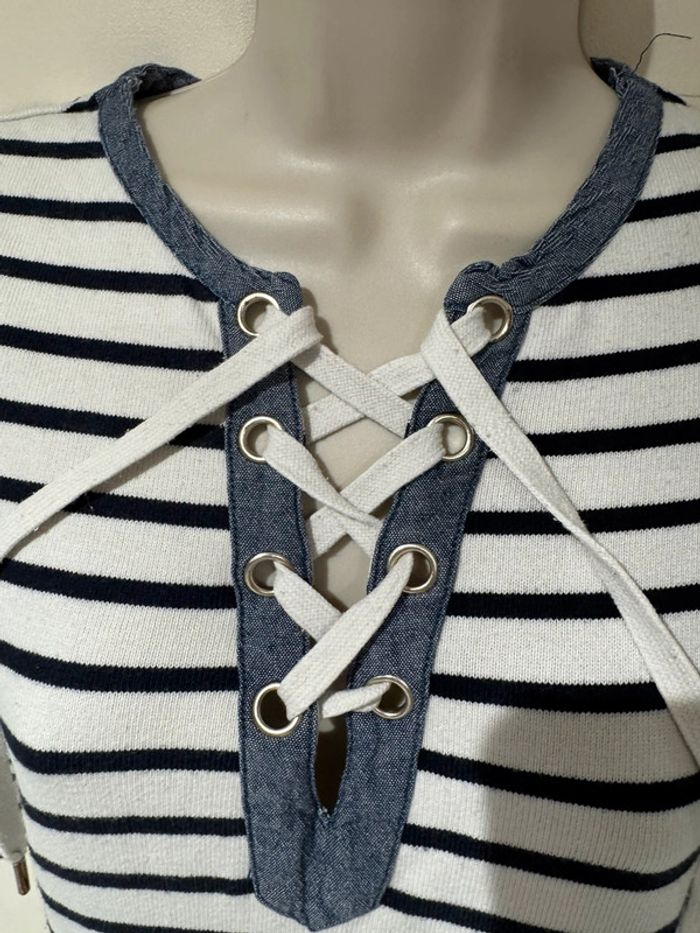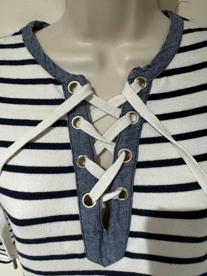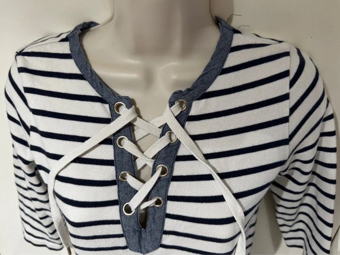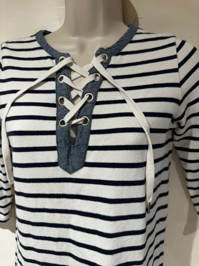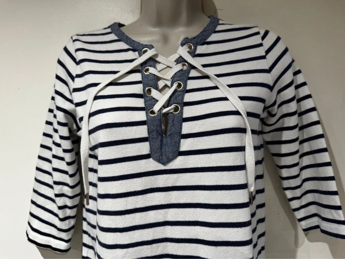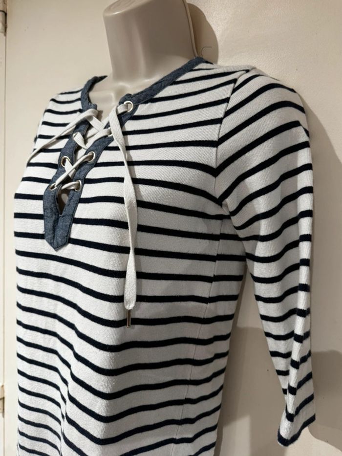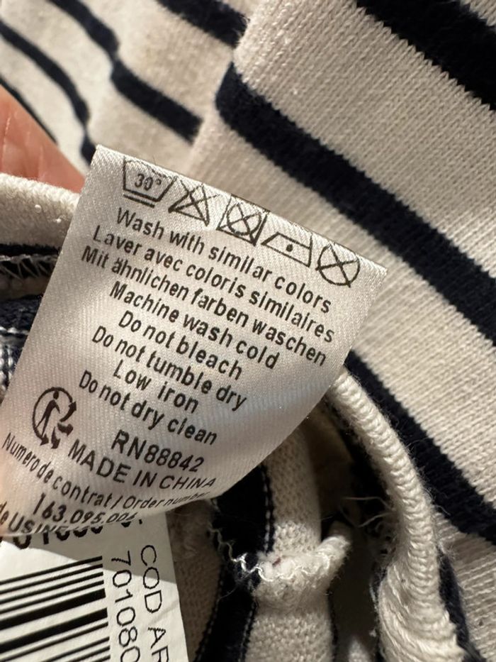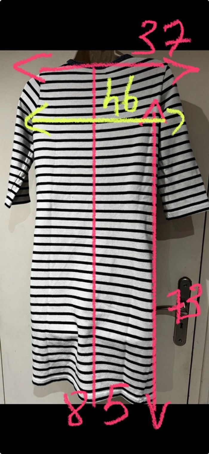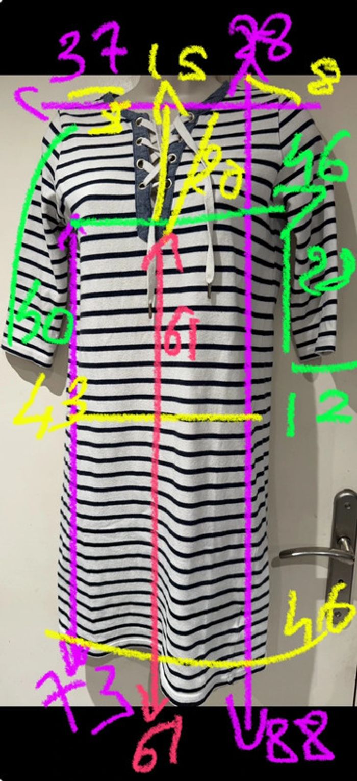 Je vends une petite robe Style Marin Toutes les mesures sont données sur photos Elle est en très bon état De la marque Cyrillus Taille M C’est un petit M après cela dépend de votre morphologie Les mesures sont prises sur une robe qui vient d’être lavée sécher au soleil. Elle pourra donc s’élargir à votre convenance. Bien entendu C’est du coton épais Pour sa composition Toutes les mesures sont données surPhotos.