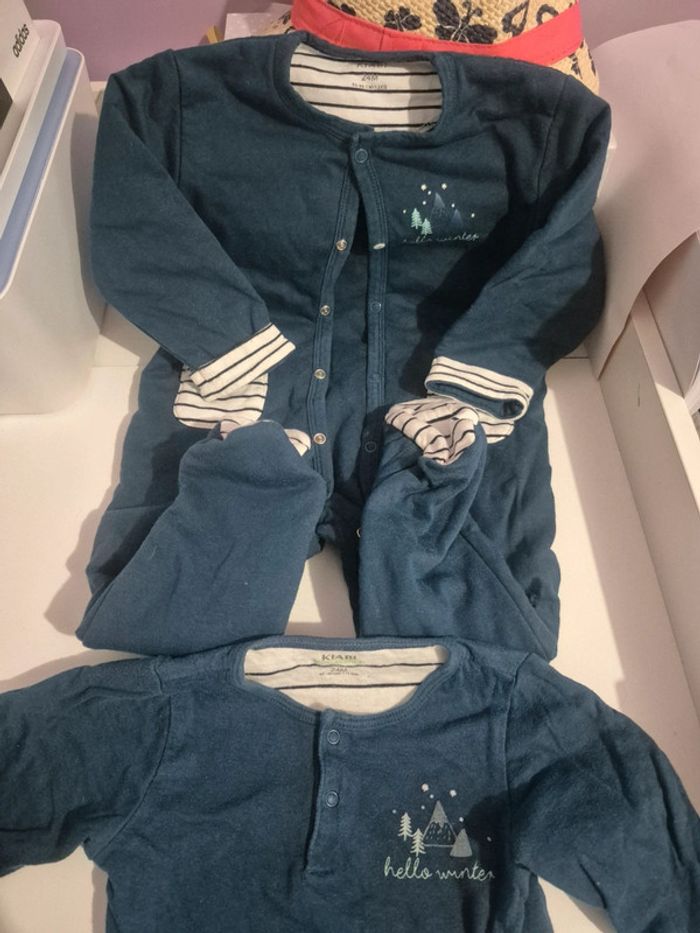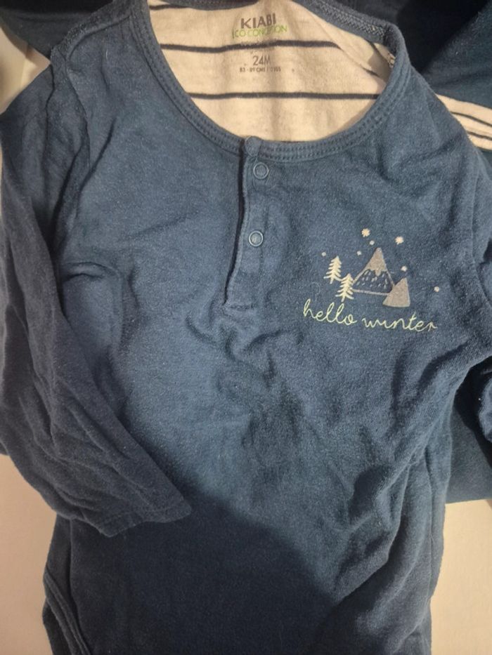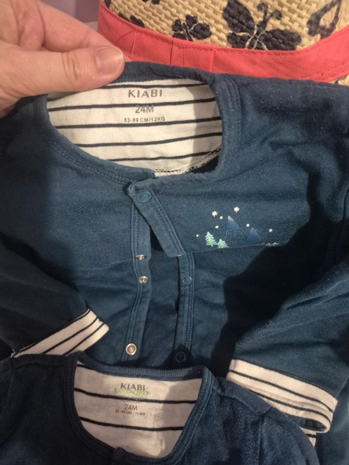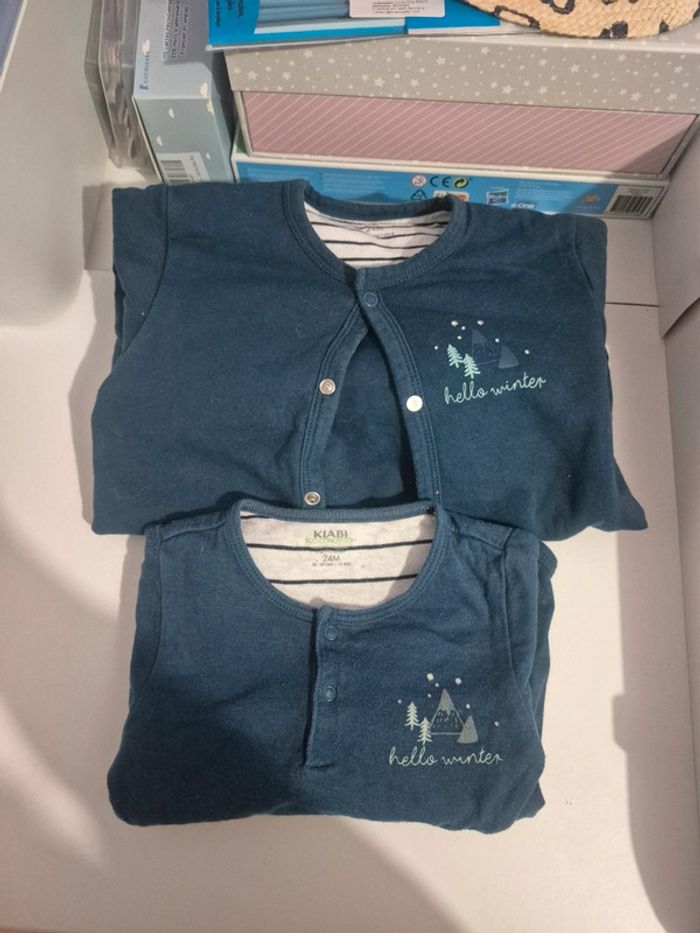 Je propose cette ensemble de bodie manche longue et pyjama une piéce 24 mois de chez kiabi. Pyjama et bodie sans trous ni tâches le bodie peu avoir quelques bouloches comme sur photos mais pas gênant. Dépôt de côlis rapide uniquement par mondial relay merci