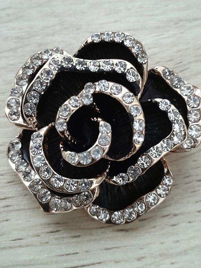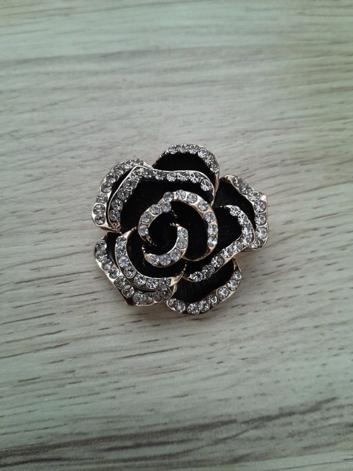 Broche fleur de Camélia couleur noire et dorée, strass - photo numéro 1