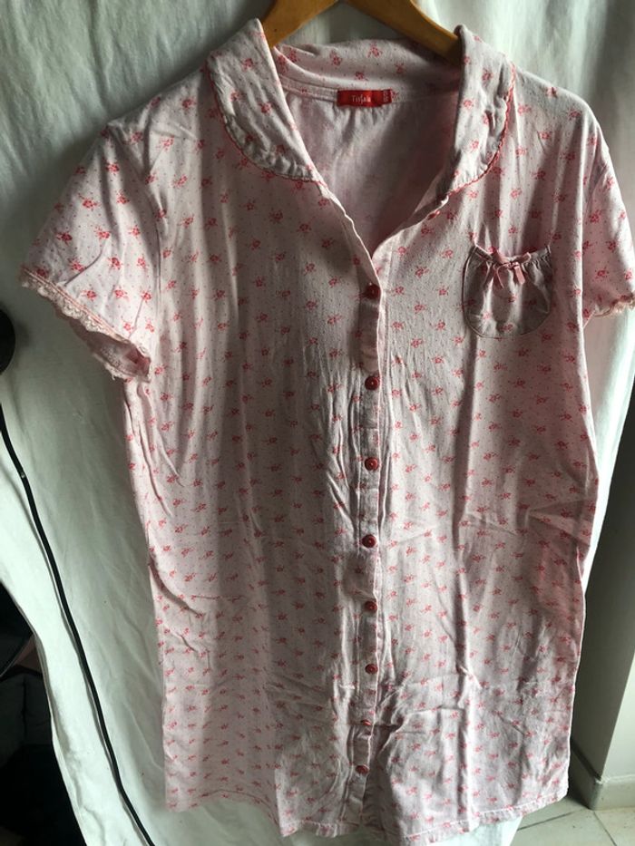 #chemisenuitfemme Portée peu de fois Manches courtes motif#fleurs Dentelle autour des manches Largeur aisselle à aisselle 54cm Boutonnage devant tous les boutons sont présents plus un bouton de secours Col Claudine #confortable