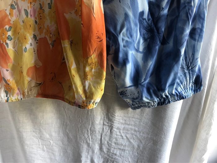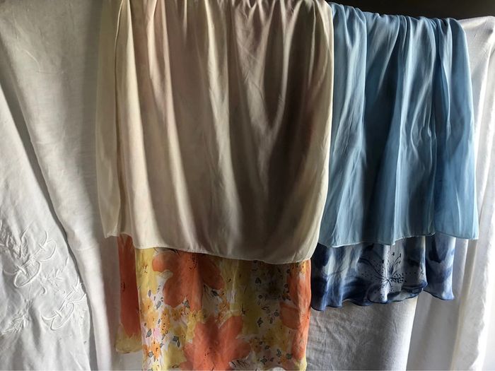 #lot de deux #jupes Doublée Plus d étiquette marque Jupe orange et jaune longueur 83cm largeur taille 33cm sans tirer sur élastique Jupe bleue plus courte longueur 66cm Largeur taille 29 cm sans tirer sur l élastique plus évasée que l autre jupe Petit raccommodage a l intérieur de la ceinture de la jupe bleue invisible Taille élastiquee