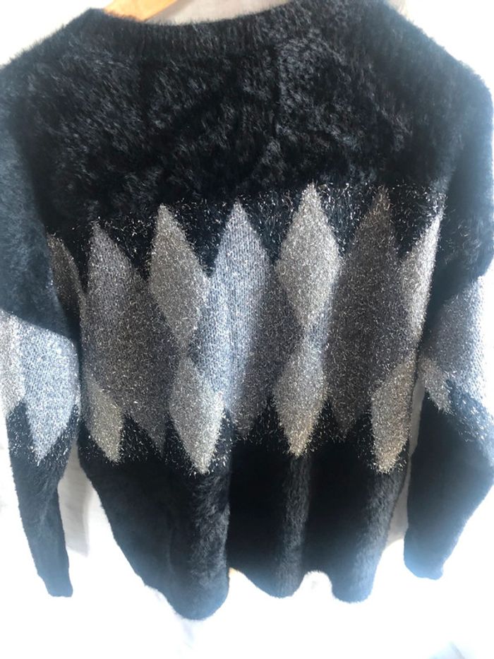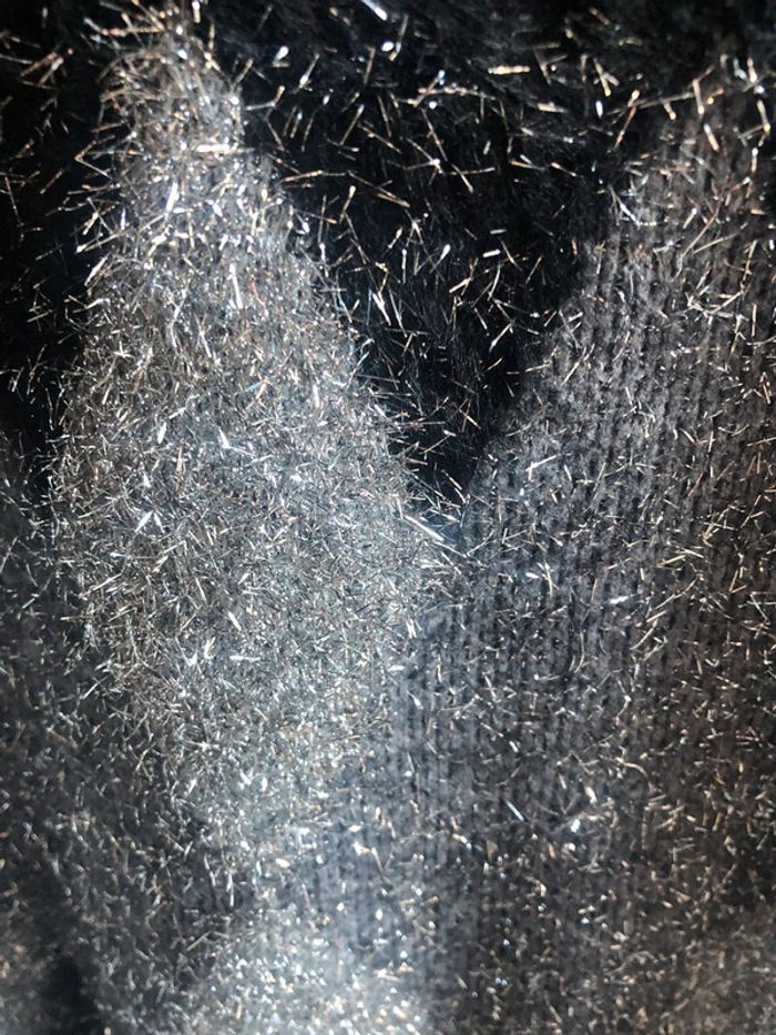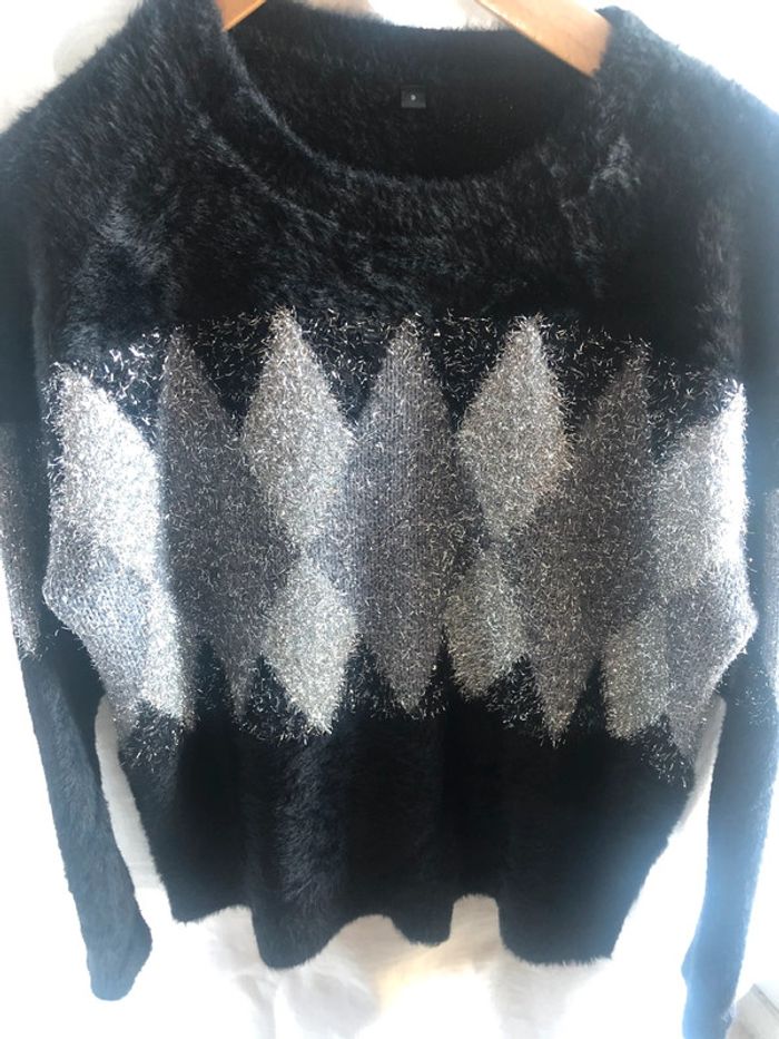 #pull #peluche #argenté #maille douce #chaud près du corps Taille 3 pas de marque pas d’étiquette Acheté en grande surface Intermarché il me semble Largeur aisselle à aisselle =58 cm Longueur 61 cm Épaule tombante largeur 61