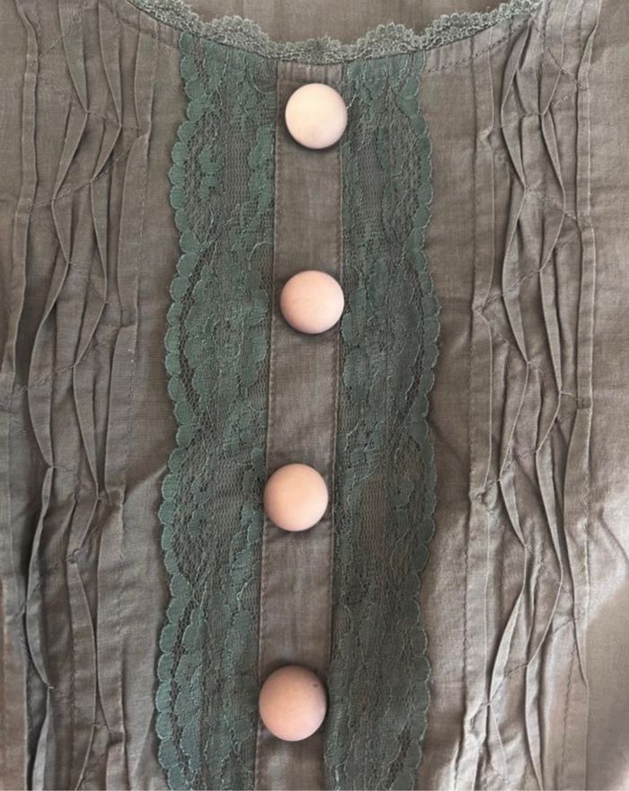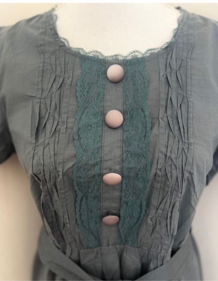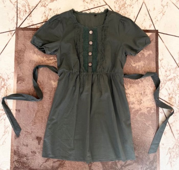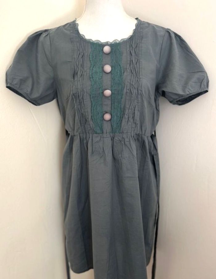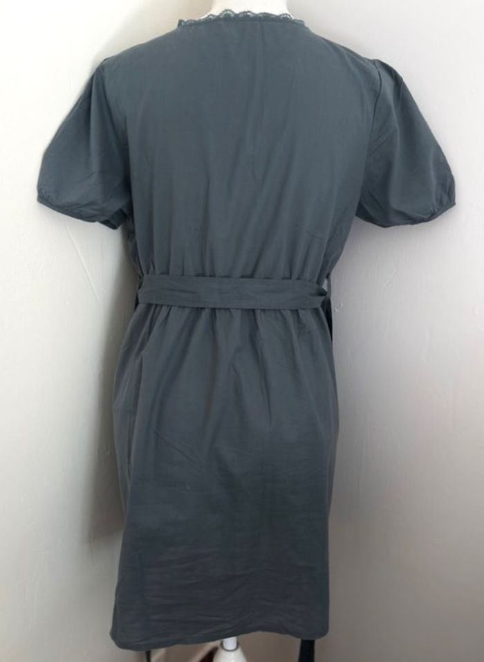Robe courte très légère Coloris gris anthracite Encolure dentelle Détails dentelle Taille 3 Taille 40 100 % coton 45 cm de largeur (mesuré à plat d'aisselle à aisselle) 85 cm de longueur Taille élastique Quelques traces délavées très très discrètes 📩Je réponds rapidement aux messages 📦Envoi rapide et soigné