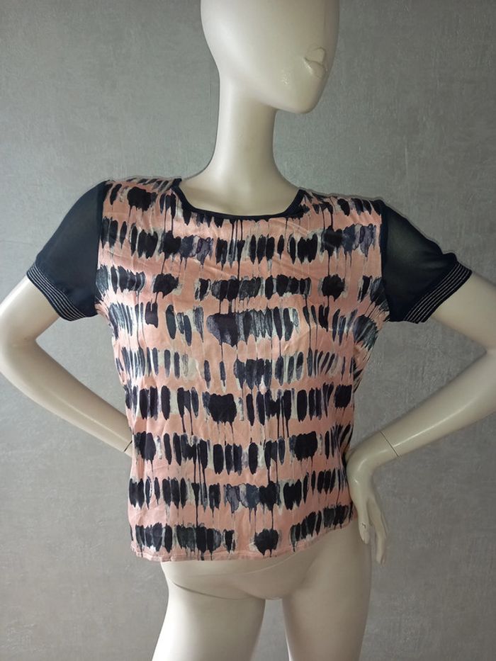 tee shirt rose et bleu marine satiné one step taille 40, matière devant : 62 % viscose et 38 % soie, matière manche : 100 % polyester, largeur aisselle à aisselle 49 cm, longueur du dessous de bras à en bas 33 cm #40petitefee3