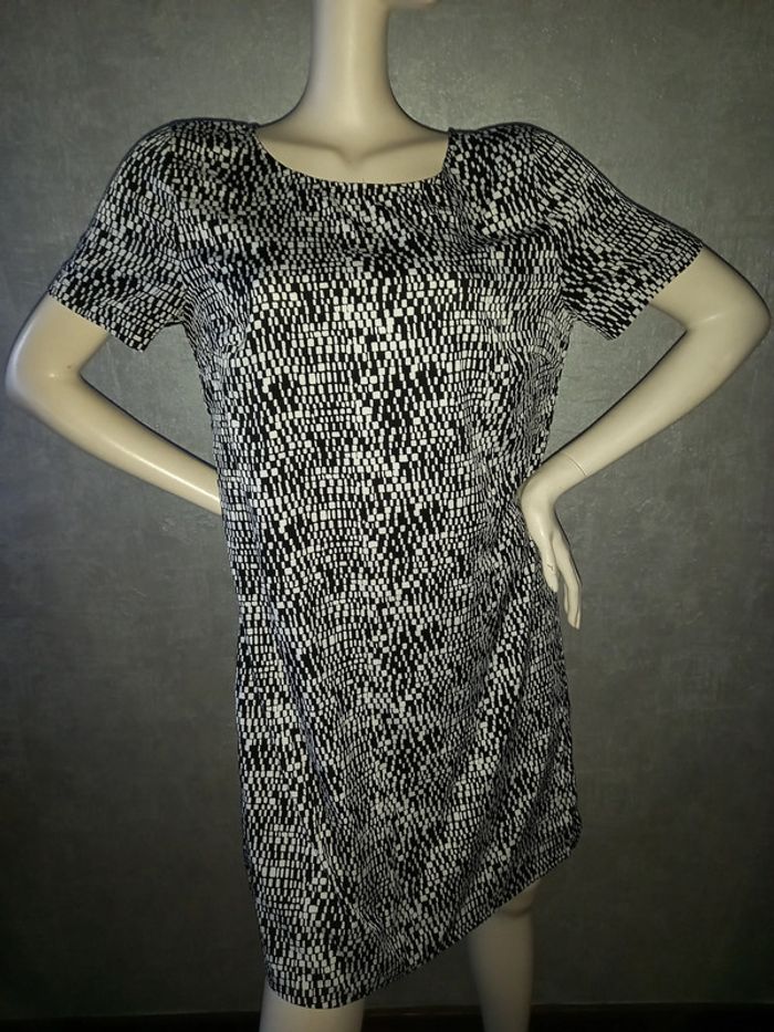 robe noire et blanche à motifs kiabi taille 42, matière fluide non élasthane ( étiquette composition coupée), largeur aisselle à aisselle 50 cm, longueur du dessous de bras à en bas 67 cm #42petitefee3