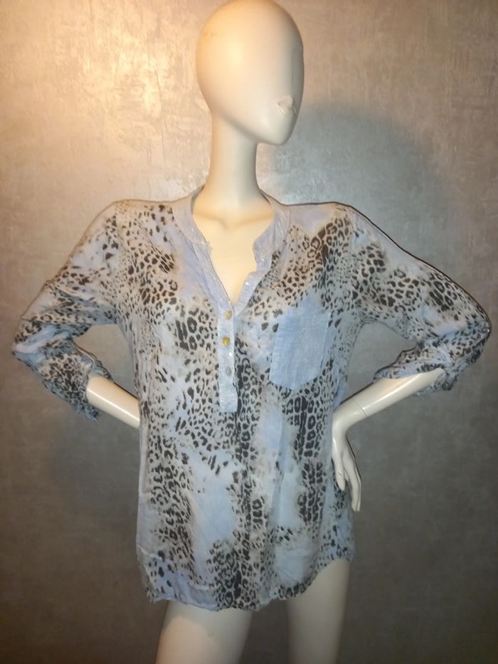 blouse bleu léopard avec séquin taille 40, largeur aisselle à aisselle 51 cm, les manches peuvent se remonter et s'attacher avec un lien, longueur du dessous de bras à en bas 46 cm #40petitefee3