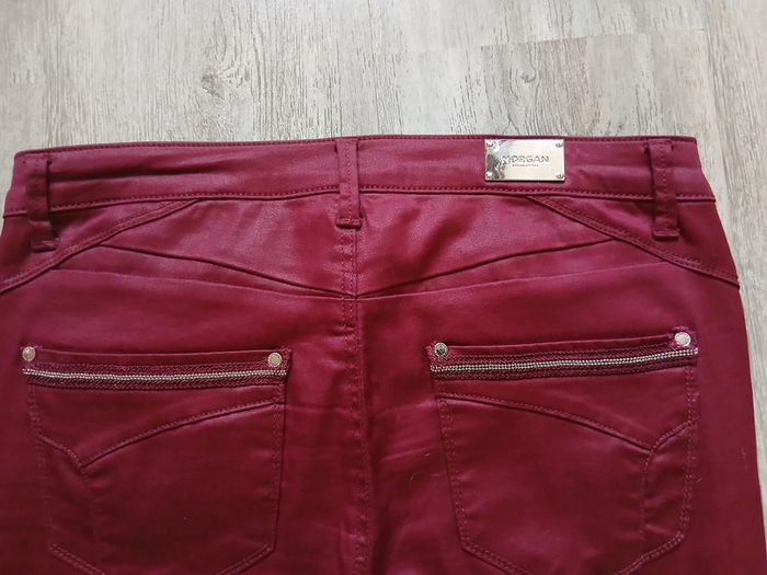 pantalon bordeaux slim enduit morgan de toi taille 40, largeur à la taille 40,5 cm, longueur de la taille à en bas 105 cm, hauteur de l'entre jambe à la taille 26 cm ,étiquette composition coupée mais matière élasthane, peu porté comme neuf #40petitefee3