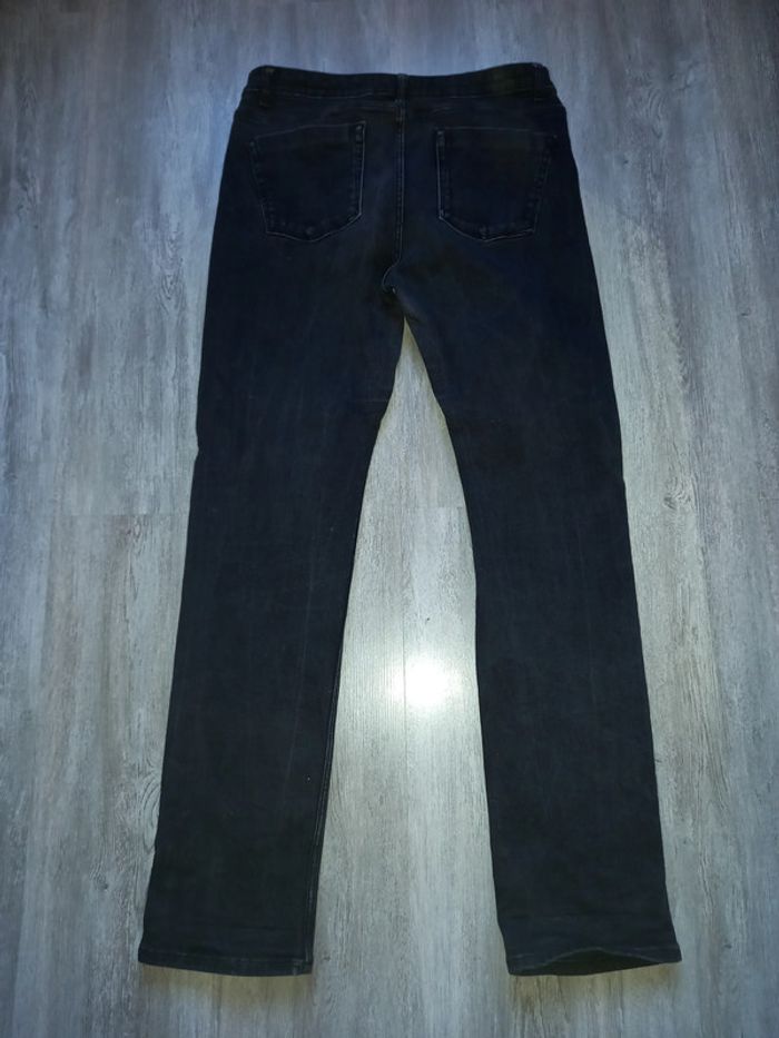jeans gris foncé élasthane régular kiabi taille 42, entre le jeans slim et le jeans droit, largeur taille 41 cm , longueur de la taille à en bas 97,5 cm matière 98 % coton et 2 % élasthane #42petitefee3