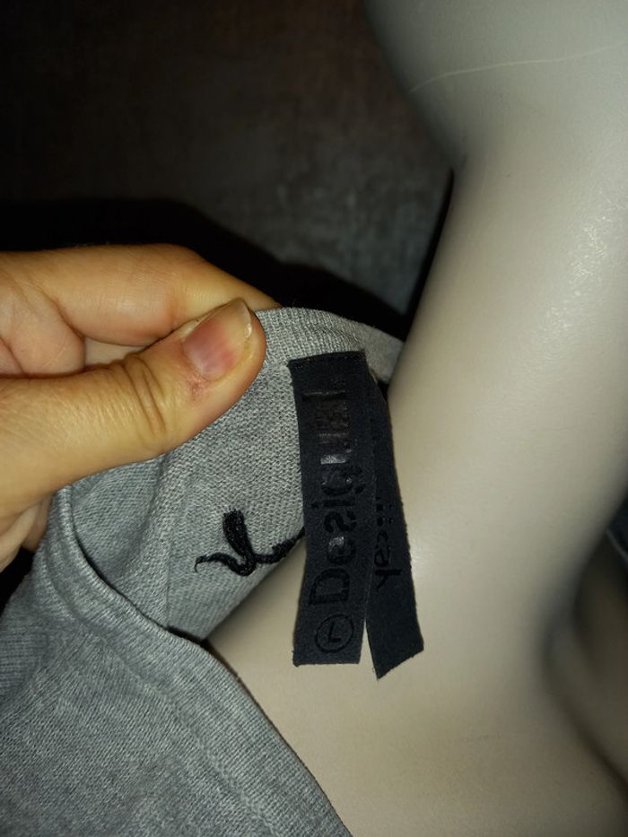 pull gris et coloré avec séquins desigual, marqué taille L mais taille 42, largeur aisselle à aisselle 50 cm, longueur du dessous de bras à en bas 45 cm, étiquette de composition coupée #42petitefee3
