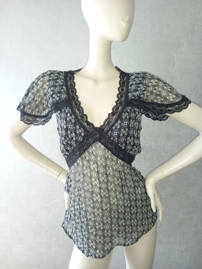 tee shirt noir et blanc dentelle taille 40, transparent mais opaque à la poitrine, étiquette composition coupée mais matière non élasthane, largeur aisselle à aisselle 51 cm, longueur du dessous de bras à en bas 43 cm #40petitefee3