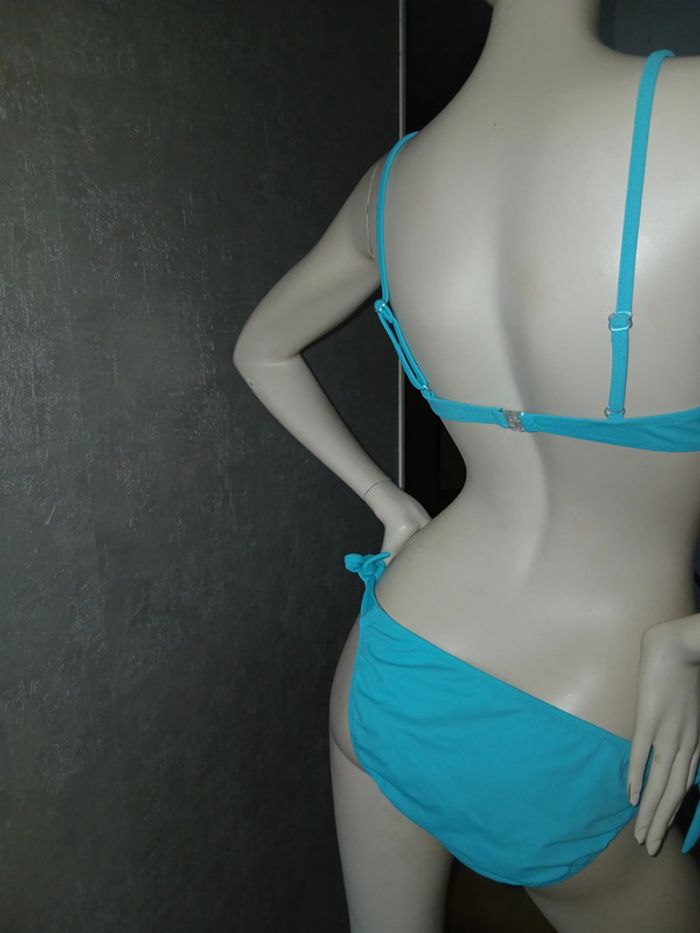maillot de bain 2 pièce turquoise taille 40, culotte réglable avec un noeud sur les cotés, haut bonnet coqué mais pas rembourré pour bonnet max jusqu'à C, bretelle réglable en longueur #40petitefee3