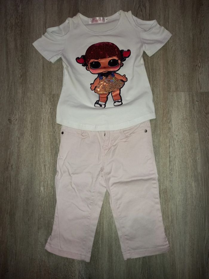 pantacourt rose ( NKY marqué 5 ans mais peut se resserrer à la taille) et tee shirt poupée LOL avec séquin taille 4 ans #4anspetitefee3
