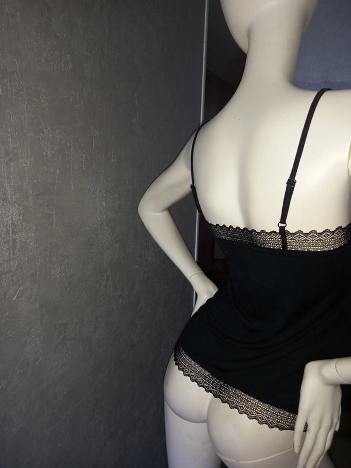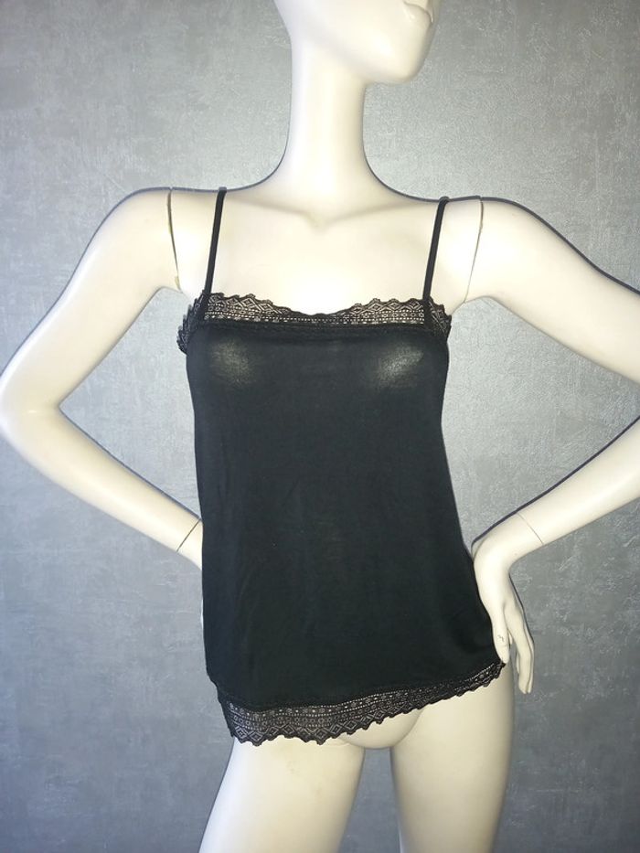 top noir et dentelle étam, marqué taille M mais taille 40, bretelle réglable en longueur, matière 95 % viscose et 5 % élasthane, largeur aisselle à aisselle 42 cm, longueur du dessous de bras à en bas 40 cm #40petitefee3