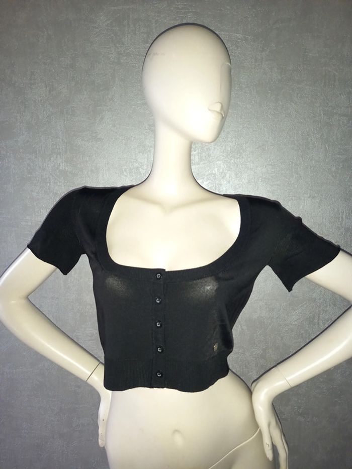 pull court à manche court morgan de toi taille 40/42, étiquette composition coupée, boutons sur le devant, matière élasthane, largeur aisselle à aisselle 42 cm, longueur du dessous de bras à en bas 25 cm