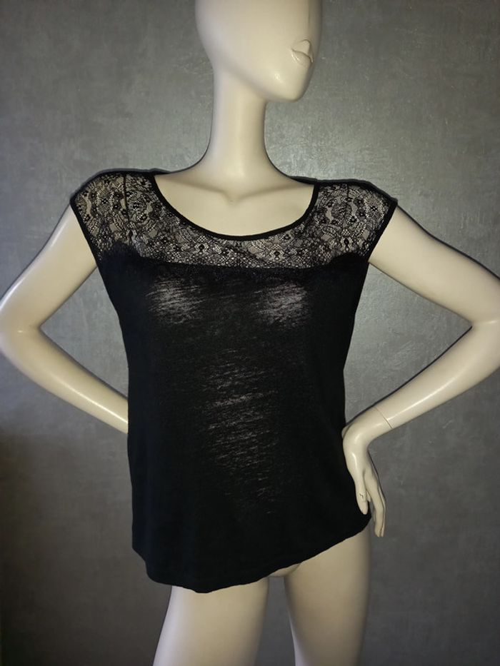 tee shirt noir et dentelle monoprix, marqué taille 2 et taille 40, largeur aisselle à aisselle 46 cm, longueur du dessous de bras à en bas 34 cm, étiquette composition coupée mais matière élasthane #40petitefee3