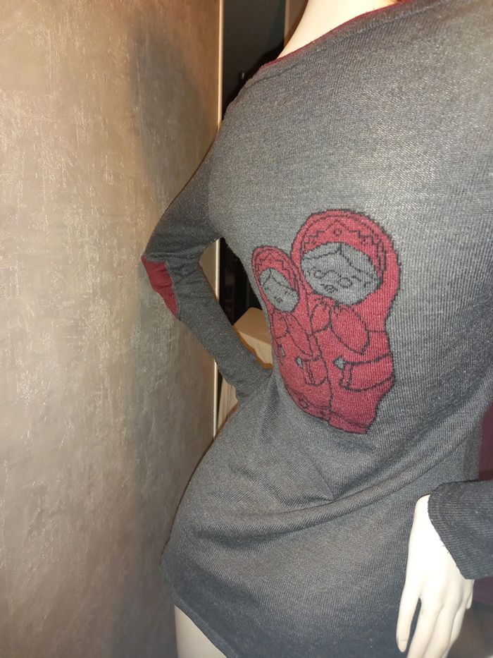 pull long gris et bordeaux camaïeu taille 38, largeur aisselle à aisselle 42 cm, dessin poupée au dos, il est fluché #38petitefee3