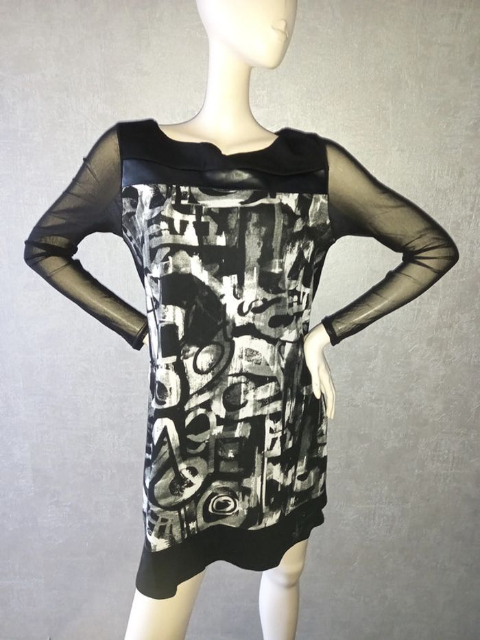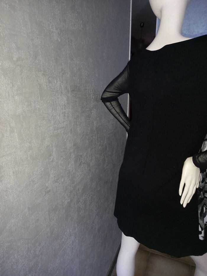 robe noire et blanche matière élasthane manche en voile taille 40, largeur aisselle à aisselle 47 cm, longueur du dessous de bras à en bas 64 cm, étiquette composition coupée #40petitefee3