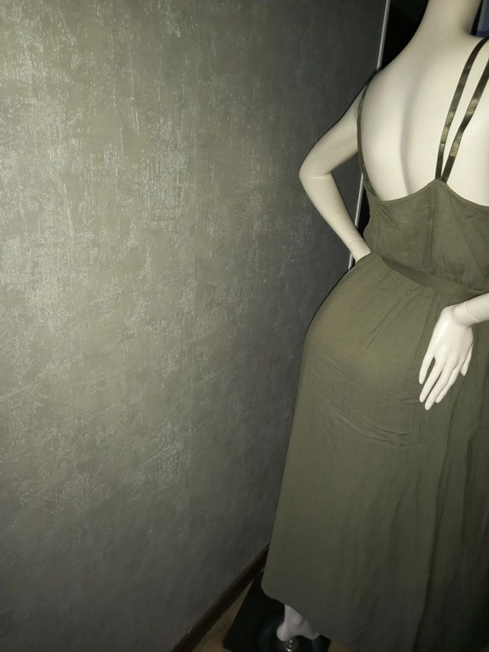 robe longue kaki avec ceinture pimkie, marqué taille 40 mais taille 42, matière 100 % viscose, largeur aisselle à aisselle 47 cm, longueur du dessous de bras à en bas 109 cm, fendue sur le devant #42petitefee3