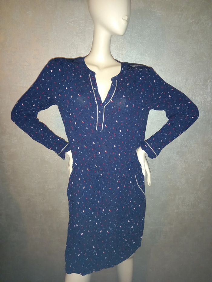robe bleu marine à motifs avec dentelle épaule gémo, marqué taille 44 mais taille 42, largeur aisselle à aisselle 52 cm, longueur du dessous de bras à en bas 71 cm, élastique à la taille, matière 100 % viscose ( non élasthane) #42petitefee3